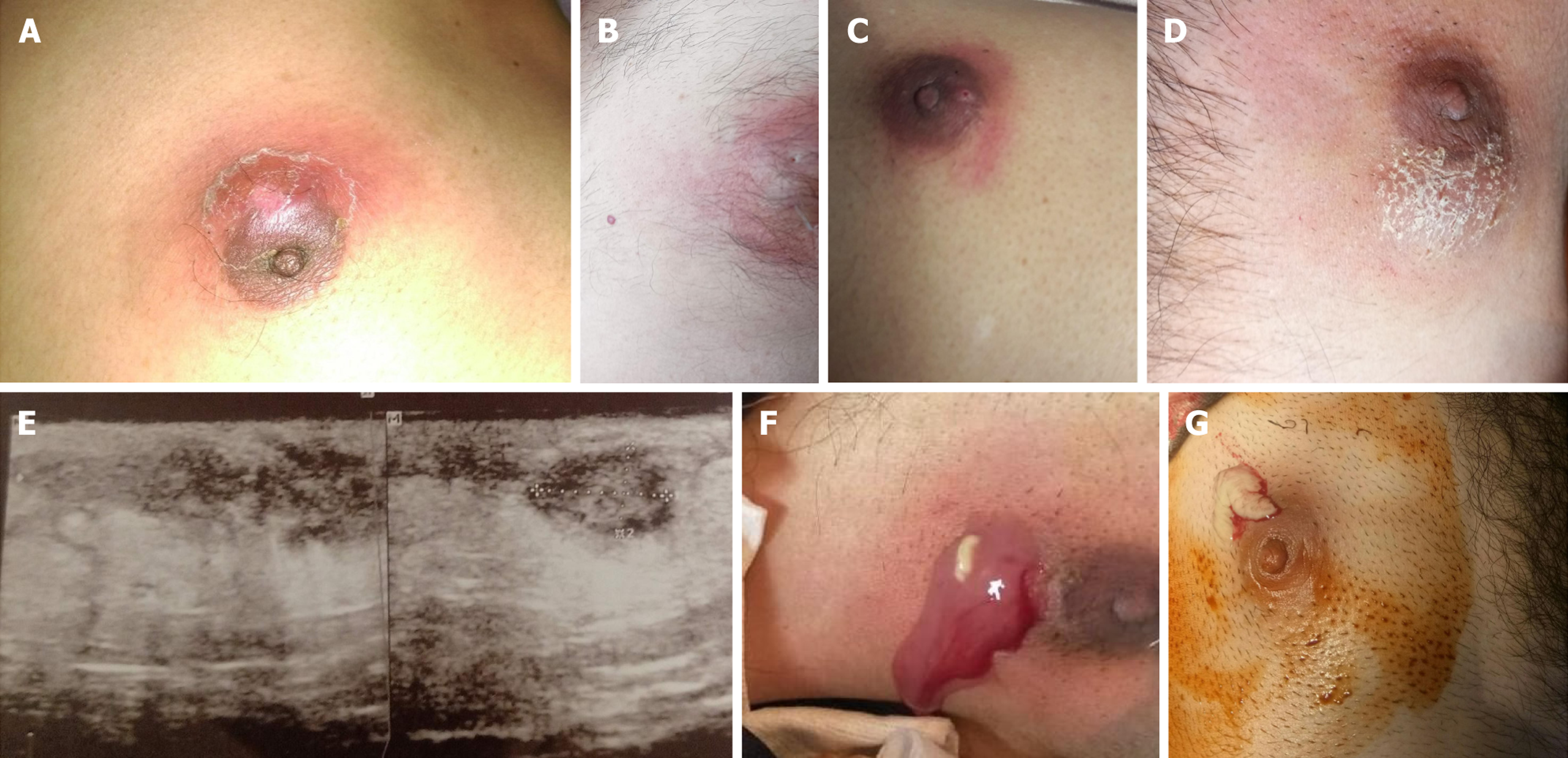 A: Showing subareolar breast abscess; B: Showing subareoar breast abscess in upper area; C: Small breast abscess in lower outer area; D: Showing large breast abscess; E: Ultrasonography breast showing breast abscess in male; F: Showing foul small pink colored thick pus after incision drainage of breast abscess; G: Showing pus coming after incision drainage.