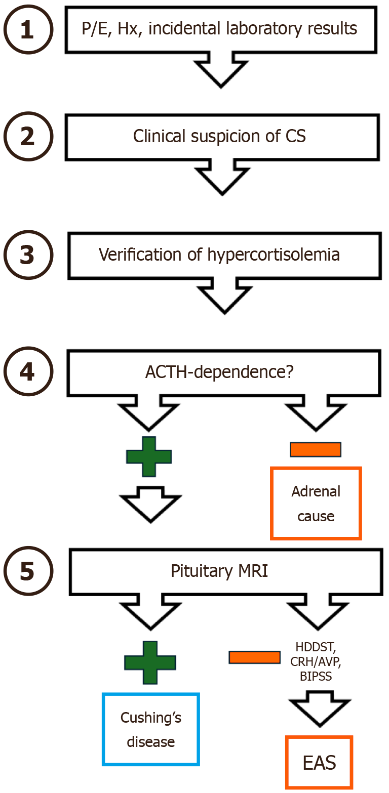 P/E: Physical examination; Hx: Patient history; CS: Cushing’s syndrome; ACTH: Adrenocorticotropic hormone; MRI: Magnetic resonance imaging; HDDST: High-dose dexamethasone suppression test; CRH: Corticotropin-releasing hormone; AVP: Arginine-vasopressin; BIPSS: Bilateral inferior petrosal sinus sampling; EAS: Ectopic adrenocorticotropic hormone secretion.