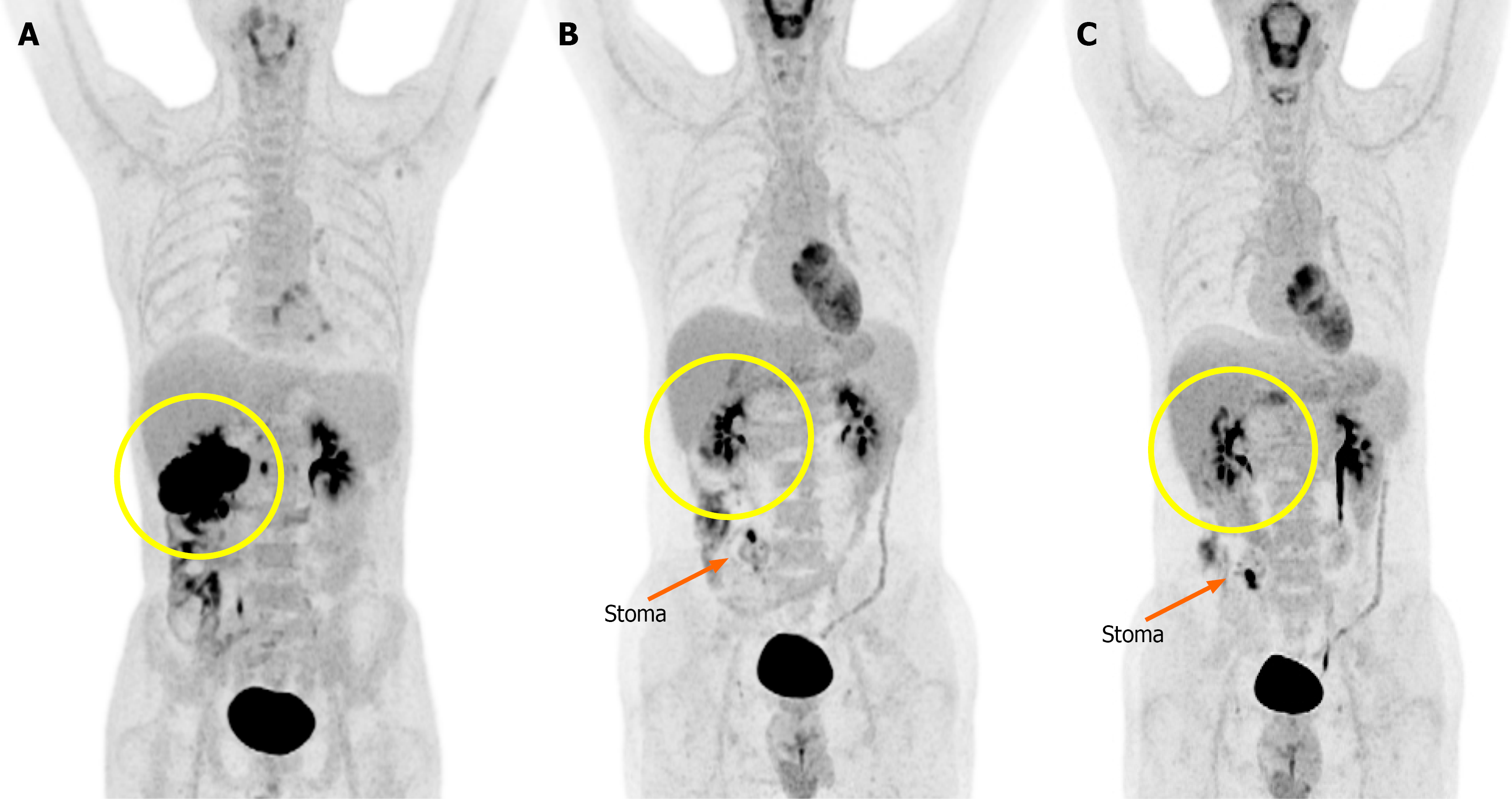 A: Baseline imaging showed intense fluorodeoxyglucose uptake in the hepatic flexure of the colon, multiple hypermetabolic liver lesions, and suspected peritoneal involvement; B: After 7 months of pembrolizumab treatment, a marked reduction in fluorodeoxyglucose uptake at the primary site and metastatic lesions was observed, indicating a significant treatment response; C: After completion of pembrolizumab treatment, complete resolution of prior hypermetabolic activity at the primary tumor site was observed. A new focal uptake was seen near the stoma and gallbladder bed, suggestive of either post-treatment inflammation or possible recurrence. The primary tumor site is marked with a yellow circle, and the stoma location is indicated by a orange arrow.