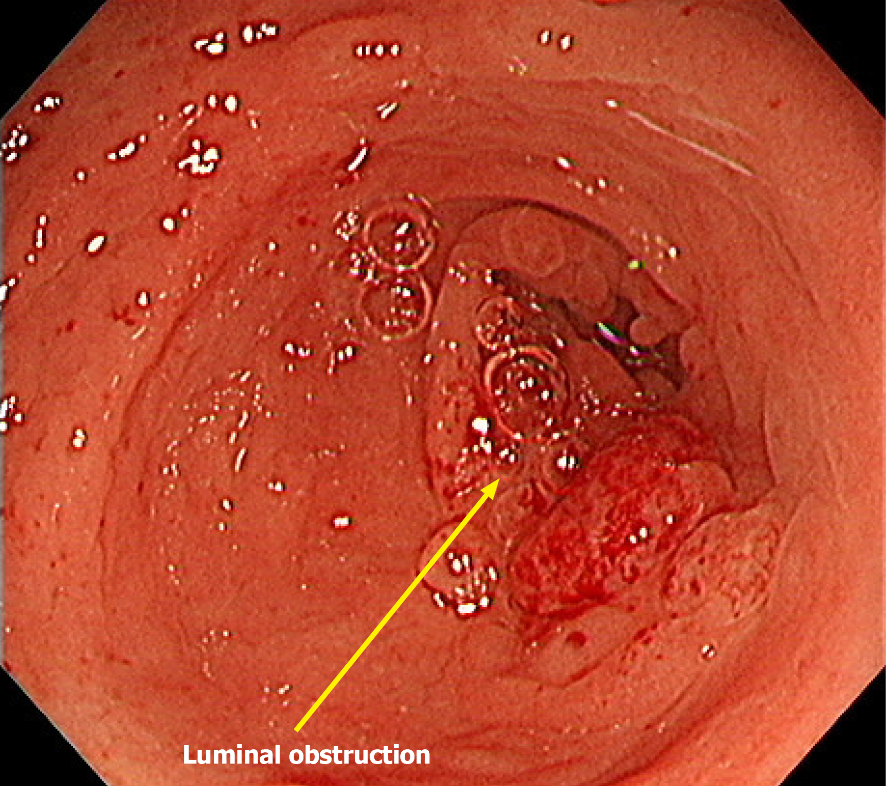 The scope was inserted through the anus and advanced to the transverse colon, but further passage was not possible due to luminal obstruction at the tumor site.