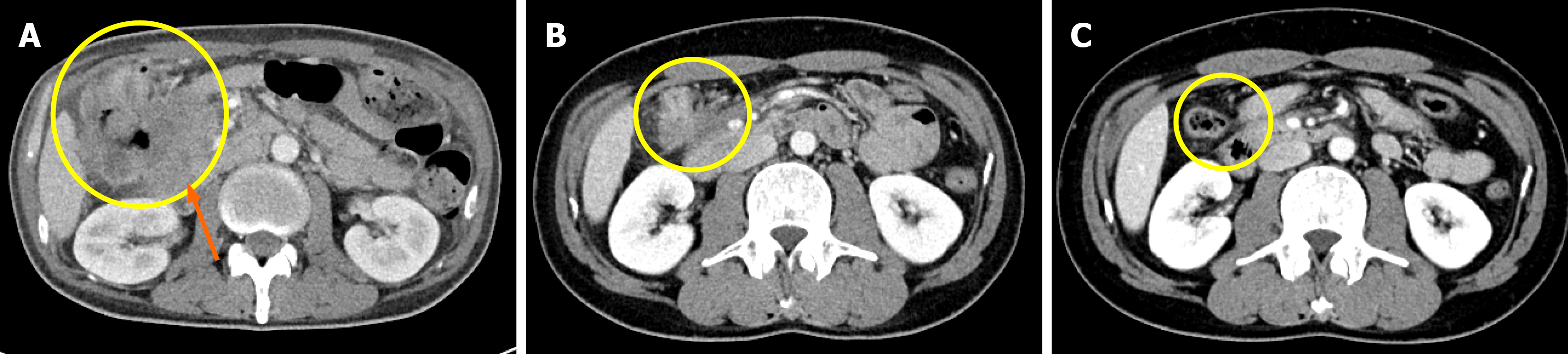 A: Baseline imaging revealed a large soft tissue mass in the proximal transverse colon with invasion into adjacent structures; B: After 6 months of pembrolizumab treatment, a marked reduction in tumor size was revealed; C: After 20 months of pembrolizumab treatment, radiologic complete response of the primary lesion was observed. The yellow circles indicate the location of the primary tumor across the treatment timeline. The orange arrow indicates the primary tumor in the colon with suspected invasion into the pancreas.