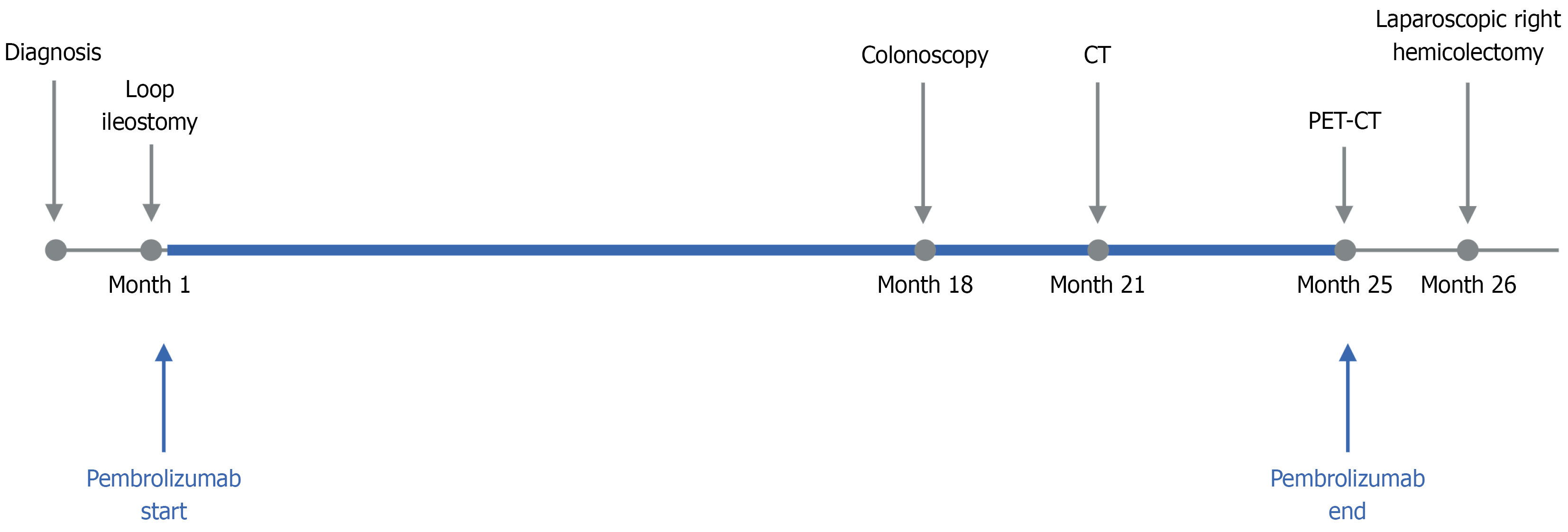 Clinical timeline showing key events from diagnosis to surgery. Pembrolizumab treatment began after loop ileostomy and continued for 36 cycles over approximately 2 years. Colonoscopy (Month 17), computed tomography (Month 21), and positron emission tomography/computed tomography (Month 25) were performed during follow-up, culminating in a laparoscopic right hemicolectomy at Month 26.