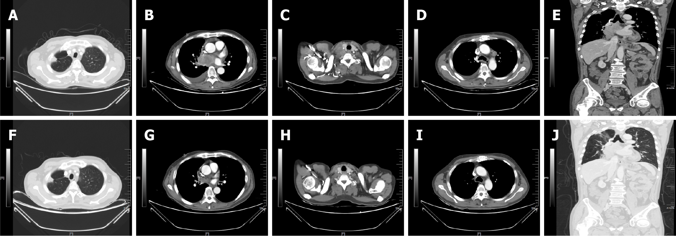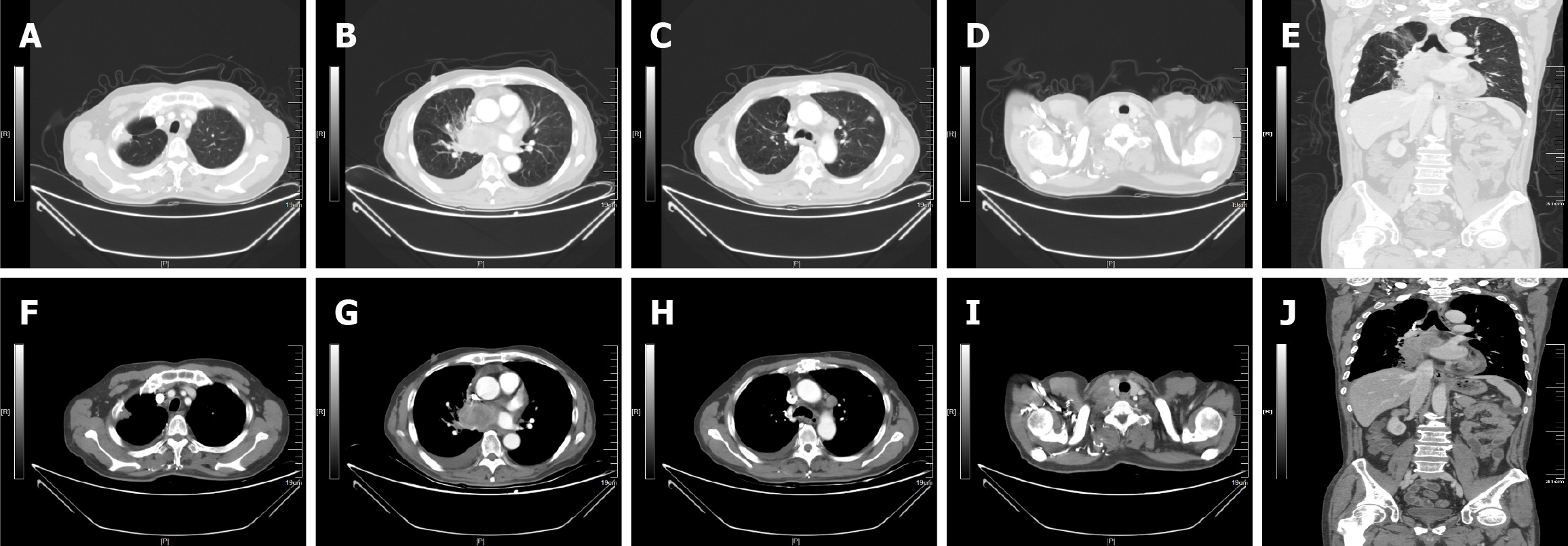 A-E: Lung window; A: The images show the local nodular thickening of the right pleura; B: The mass film shadow near the right lung portal; C: The images show the pleural effusion; D: The images show the cervical lymph nodes metastasis; E: Coronal observation shows that the mediastinal lymph nodes are enlarged; F-J: Mediastinal window; F: The images show the local nodular thickening of the right pleura; G: The mass film shadow near the right lung portal; H: The images show the pleural effusion; I: The images show the cervical lymph nodes metastasis; J: Coronal observation shows that the mediastinal lymph nodes are enlarged.
