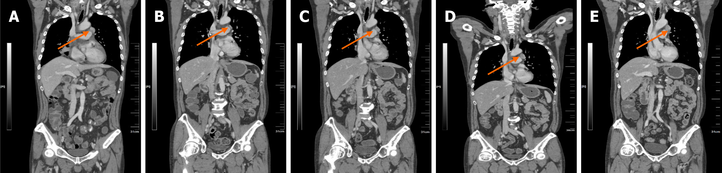 A: On May 31, 2023; B: On May 7, 2024; C: On July 10, 2024; D: On September 11, 2024; E: On November 11, 2024. The orange arrows in the figures point to the metastatic left diaphragmatic angle lymph node.