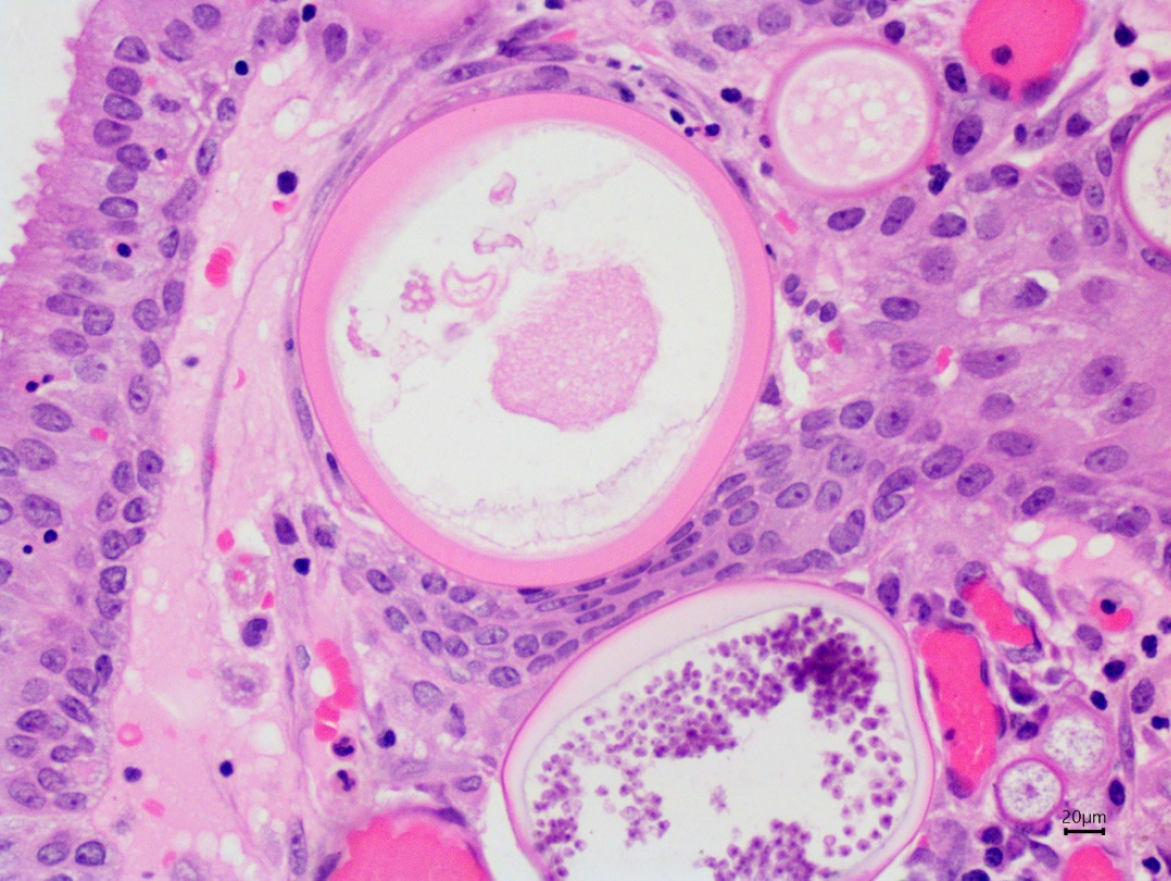 The excised mass showed thick-walled sporangia rupturing to release endospores, suggestive of rhinosporidiosis.