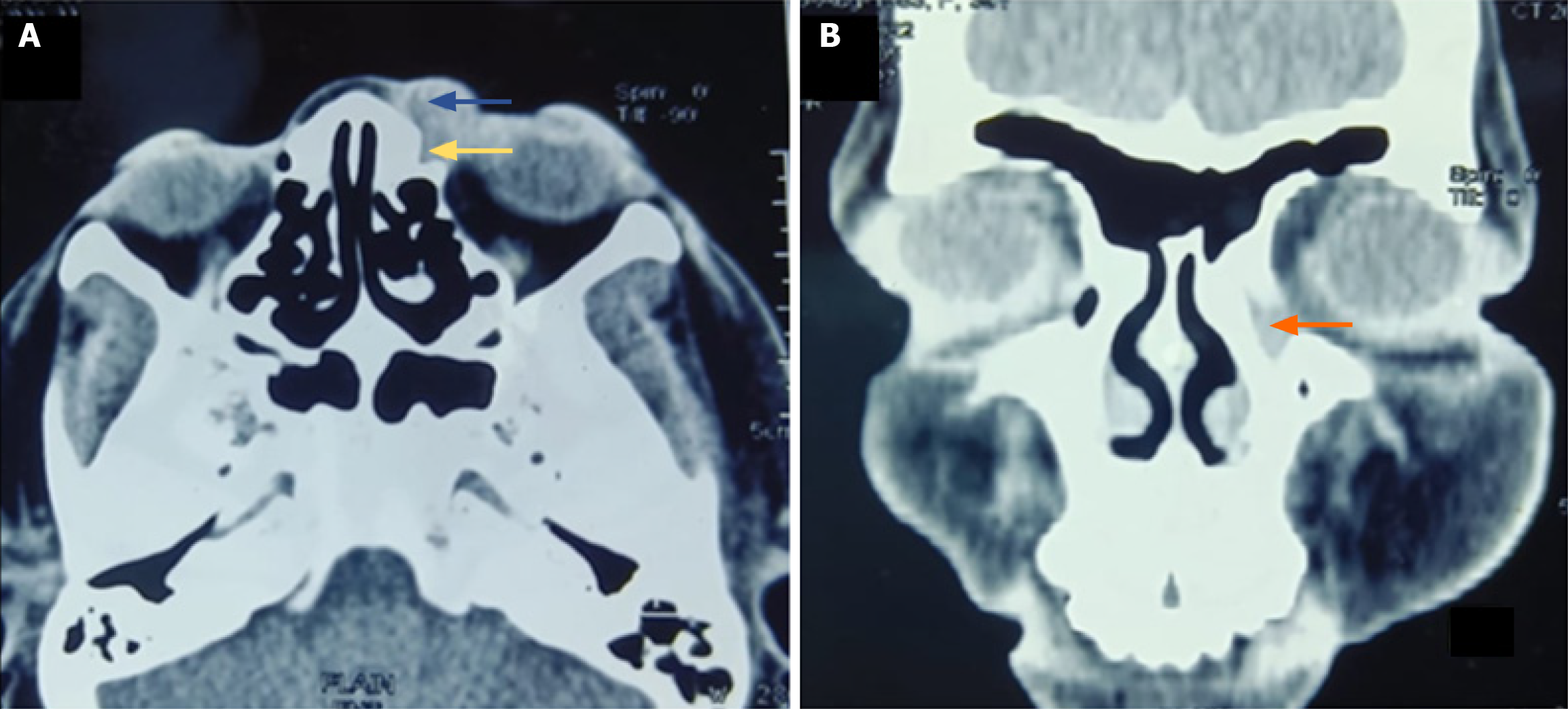 A and B: Isodense mass lesion in lacrimal sac area showing extension into preseptal area (marked with yellow arrow), left nasolacrimal duct (marked with orange arrow).