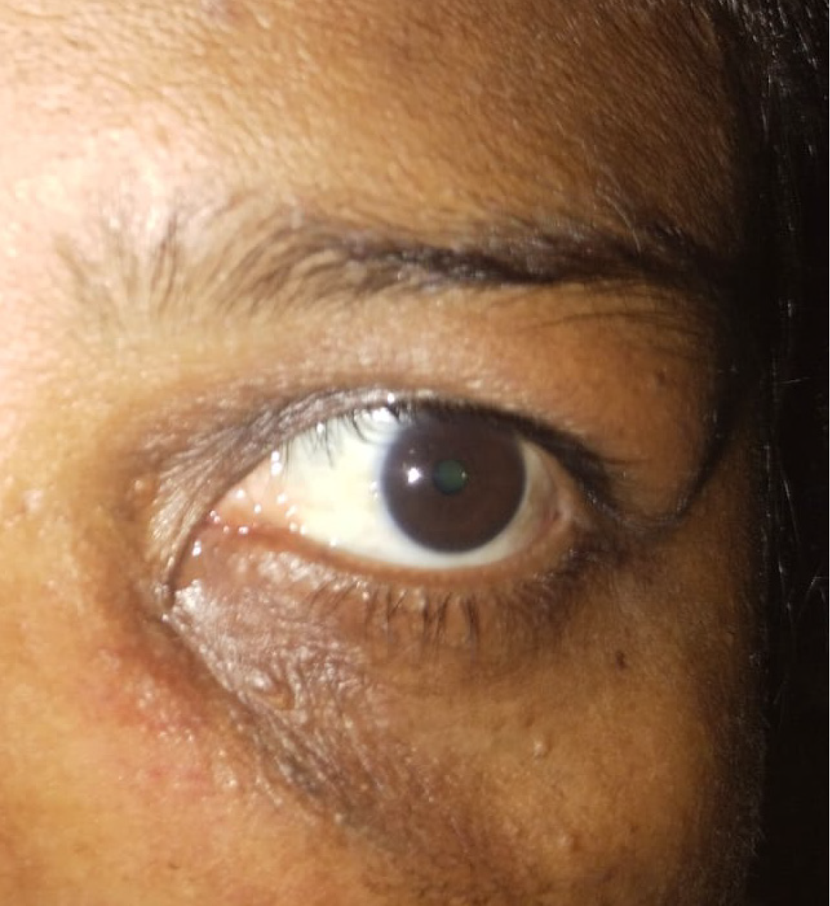 The photo shows a healthy periocular area near medial canthus, with the patient showing no recurrence at 3 years postoperatively.
