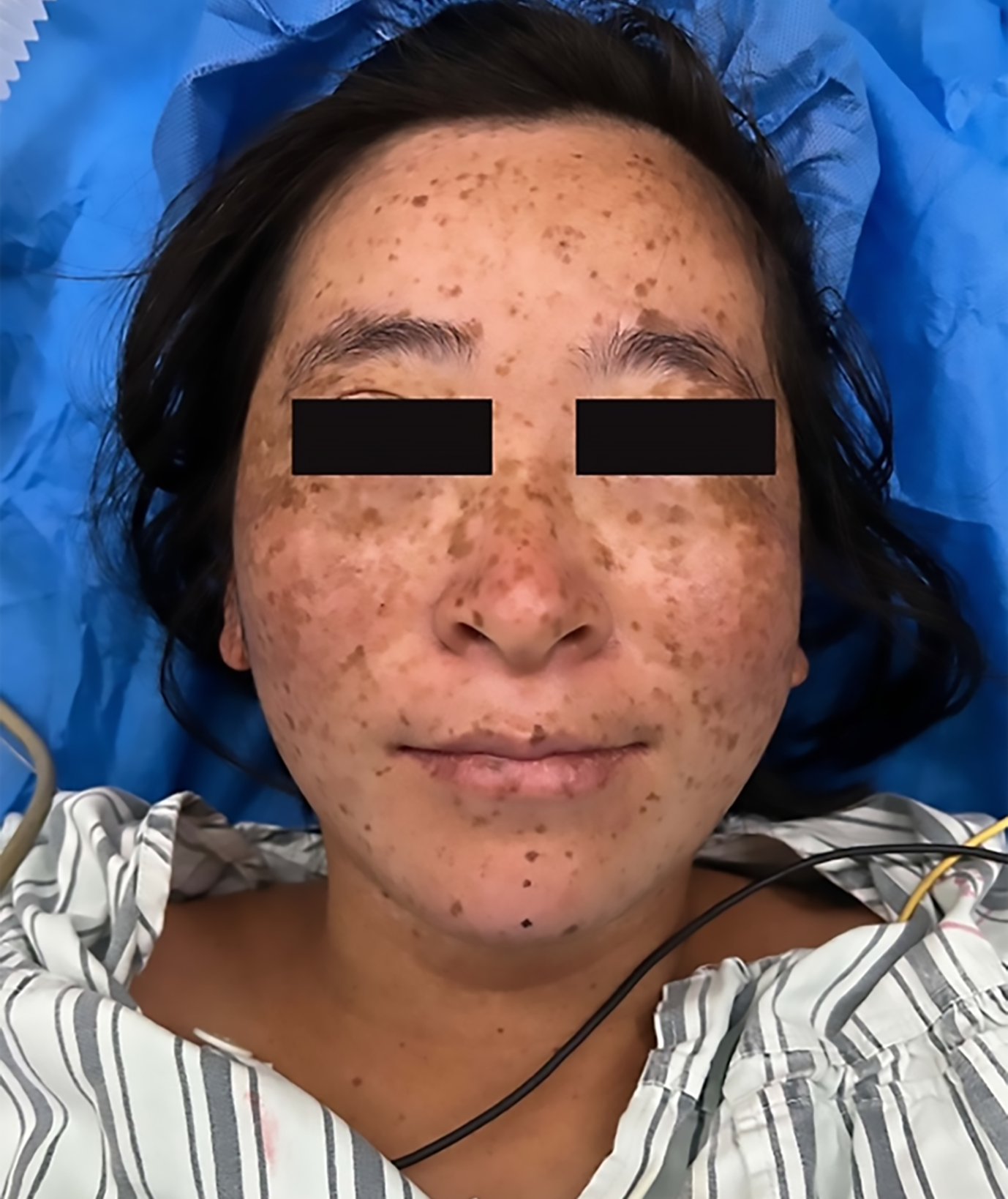 Figure 1 Facial appearance of the patient diagnosed with dyschromatosis universalis hereditaria, showing widespread reticulated hyperpigmented macules predominantly on the forehead, cheeks, and nose.