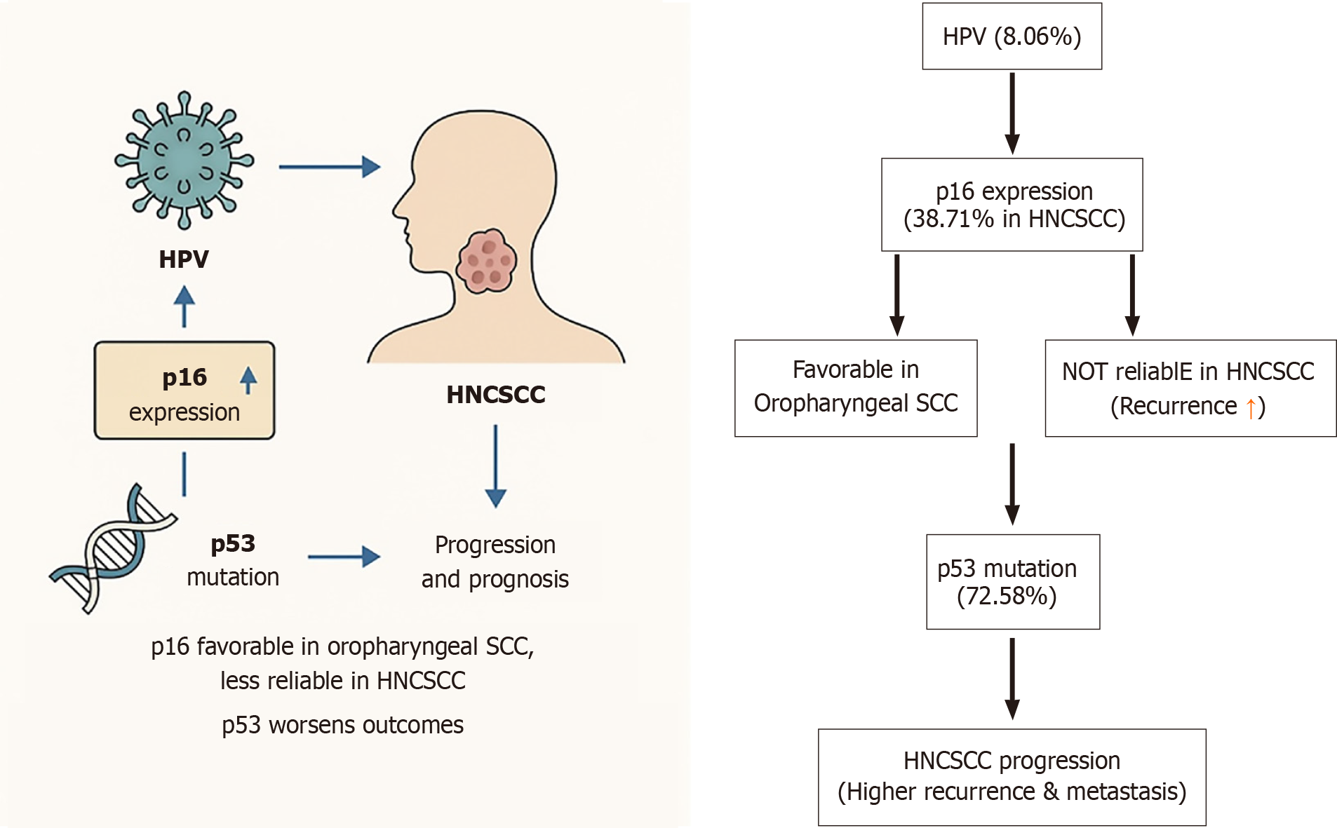 Human papillomavirus infection, p16 expression, and p53 mutations are interconnected factors influencing head and neck squamous cell carcinoma (HNCSCC) development, progression, and prognosis. While p16 is favorable in oropharyngeal squamous cell carcinoma, it is less reliable in HNCSCC, especially when combined with p53 mutations, which worsen outcomes. These biomarkers are essential for understanding and managing HNCSCC. HPV: Human papillomavirus; HNCSCC: Head and neck squamous cell carcinoma; SCC: Squamous cell carcinoma.
