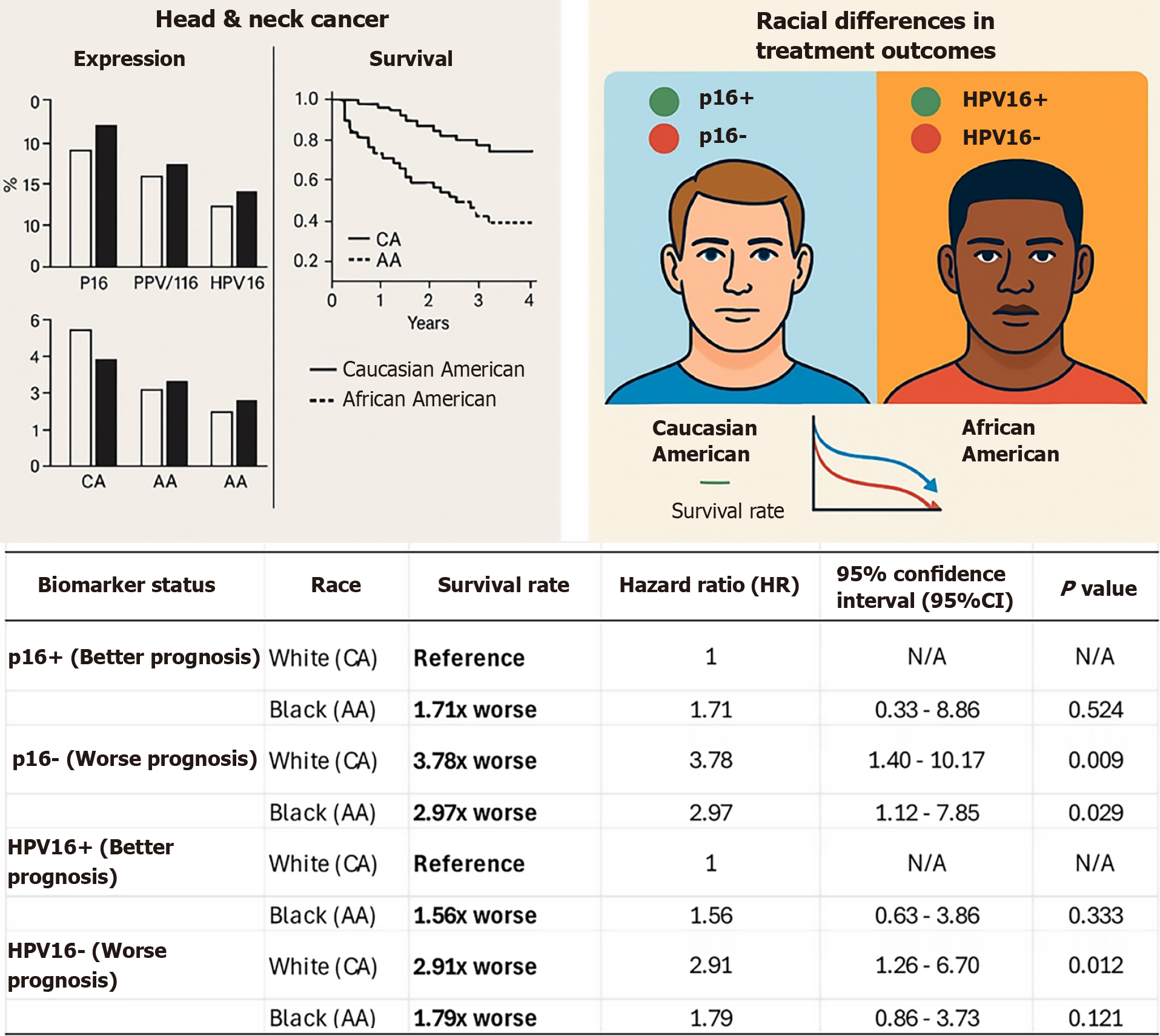The table compares survival rates, hazard ratios, and P values for head and neck cancer patients based on biomarker status and race (Caucasian American vs African American). Specifically, p16+ (better prognosis): P16+ is generally associated with better prognosis, but survival disparities exist between races. p16- (worse prognosis): P16 is linked to significantly worse survival rates, especially among Caucasian patients. Human papillomavirus (HPV) 16+ (better prognosis): HPV16+ is associated with improved survival, though the effect varies between racial groups. HPV16- (worse prognosis): HPV16 results in significantly worse survival outcomes, particularly for Caucasian patients. HPV: Human papillomavirus; CA: Caucasian American; AA: African American; HR: Hazard ratio; CI: Confidence interval; N/A: Not applicable.