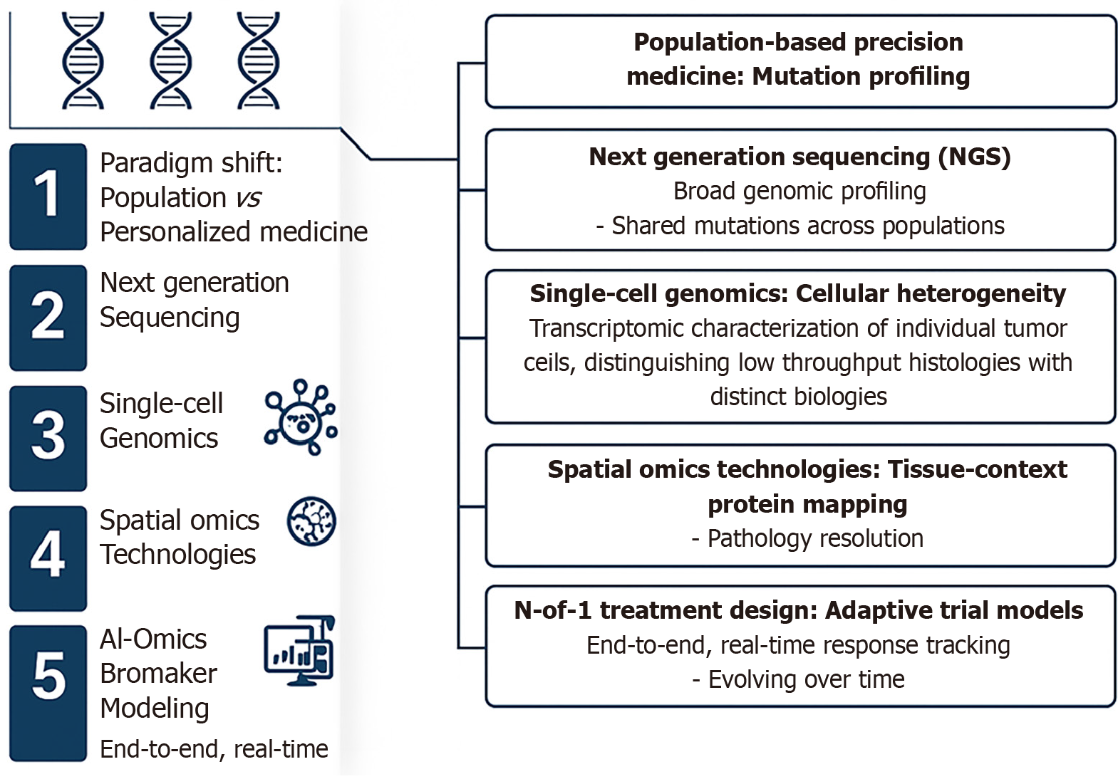 Figure 3 Comprehensive and visually structured overview of the evolution of precision medicine, tracing its development from population-based mutation profiling toward fully personalized, spatiotemporal cancer care.