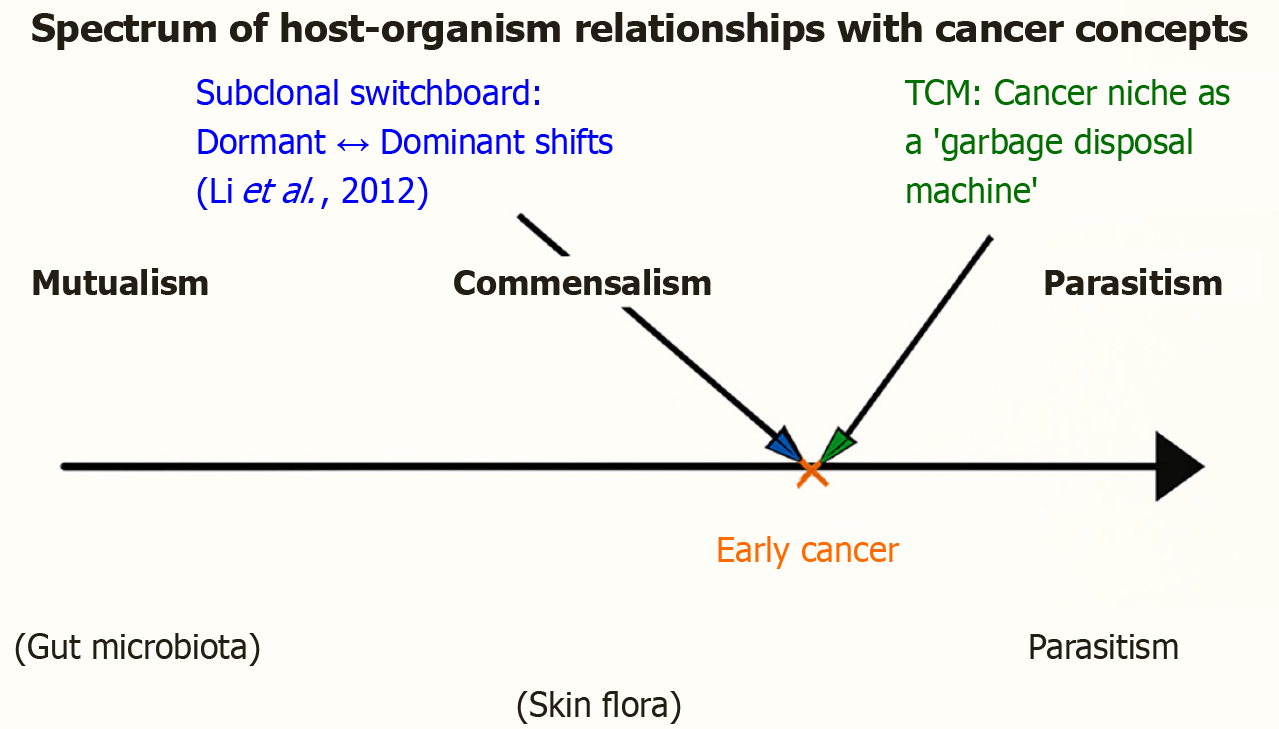 The continuum of biological interactions ranges from mutualism (benefiting both partners; e.g., gut microbiota), through commensalism (benefiting one partner without harming the other; e.g., skin flora), to parasitism (benefiting one at the expense of the other; e.g., malaria parasite). Early cancer is positioned closer to parasitism but not at the extreme, reflecting its dual role as both a host threat and a potential trainer of immunity. Two conceptual frameworks are overlaid: (1) Cancer niche as a “garbage disposal machine”, Li et al[72], 2019, for subclones, Li et al[73], 2012; green annotation: Highlighting how tumors may buffer metabolic imbalance and function transiently as regulatory sinks within the body-disease continuum, echoing traditional Chinese medicine concepts of balance; and (2) Subclonal switchboard signaling, Li et al[73], 2012; blue annotation: Emphasizing that dominant and dormant cancer subclones dynamically exchange roles, shifting the tumor’s position along the spectrum and driving progression or recurrence. Together, these perspectives reframe cancer not merely as a destructive parasite, but as part of a coevolutionary dialogue with the host, spanning the continuum of mutualism, commensalism, and parasitism.