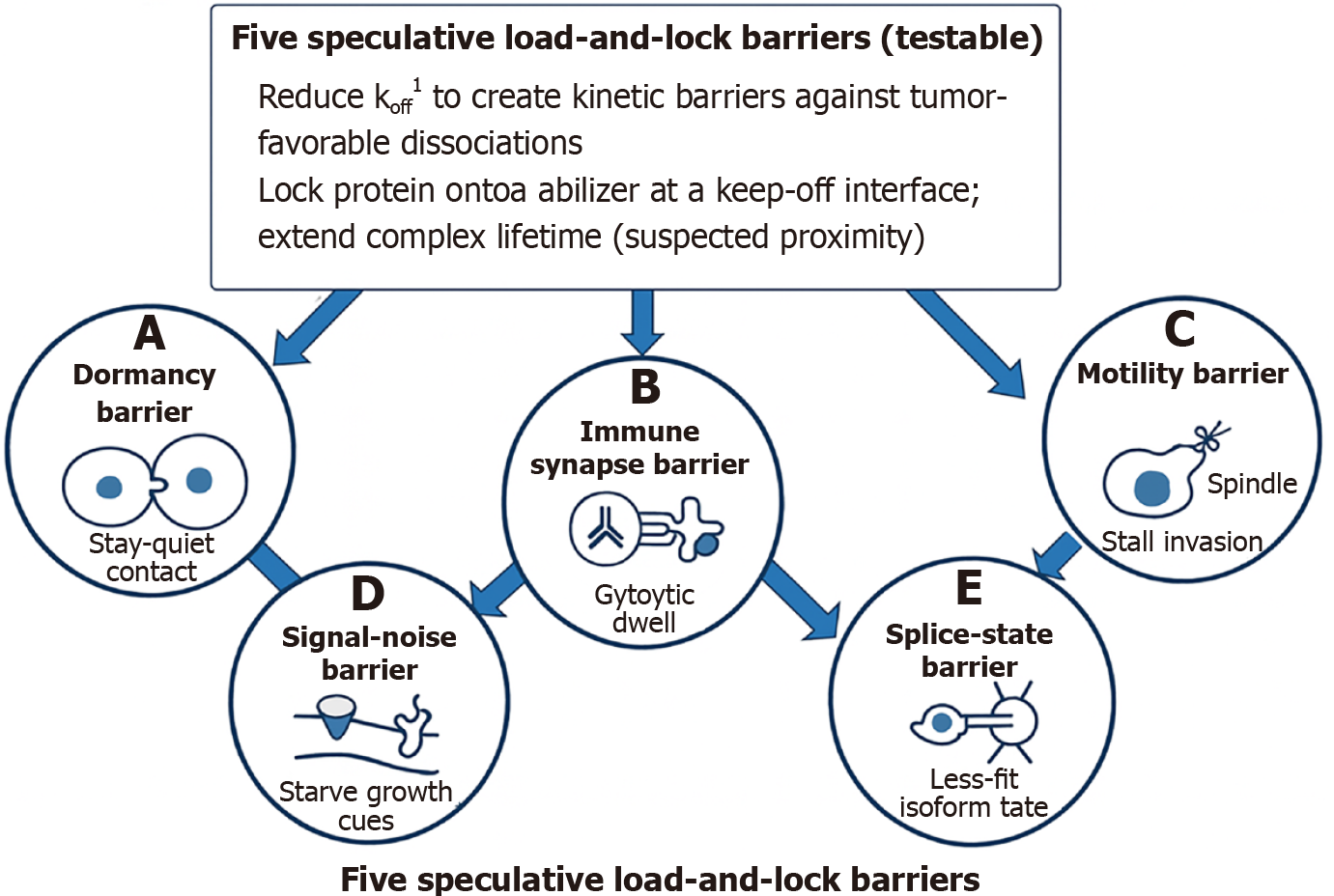 This illustration summarizes a unifying load-and-lock strategy designed to kinetically trap tumor-promoting cellular states by reducing the dissociation rate (koff) of critical molecular interactions. At the center, the strategy emphasizes stabilizing complexes at key interfaces to extend residence time and block rapid transitions. A-E: Radiating from this core are five mechanistically distinct barriers: Dormancy barrier: Locks “stay-quiet” tumor-niche contacts to maintain subclone quiescence and prevent reactivation (A); immune synapse barrier: Locks cytotoxic T cell-tumor synapsed well while blocking immune checkpoint rebinding to enhance killing (B); motility barrier: Locks mitotic motors like KIF18A to stall cell cycle progression and metastatic invasion (C); signal-noise barrier: Locks latent growth inhibitors and decoys ligands to reduce signaling noise and plasticity (D); splice-state barrier: Locks spliceosomal assemblies to bias tumors toward less-fit isoform states (E). Each barrier is represented with a simplified icon and linked to the central load-and-lock concept, illustrating how kinetic stabilization across diverse molecular axes can synergistically constrain tumor evolution. 1koff is the “escape rate” of a molecular handshake. Reducing it means tightening the grip, increasing residence time, and functionally locking tumor biology into less dangerous states. In molecular binding kinetics, koff (the dissociation rate constant) describes how quickly a bound complex falls apart. Mathematically, it has units of per second and represents the probability per unit time that a complex (e.g., protein-ligand, receptor-drug, or synapse contact) will dissociate back into its separate components. A lower koff = slower unbinding - the interaction is more stable, with longer residence time (the duration the complex stays intact). This is distinct from kon (association rate constant), which describes how quickly binding occurs. The load-and-lock strategy is essentially about slowing koff across different molecular systems. By making complexes last longer (kinetically trapping them), you extend functional effects: (1) Dormancy niches hold tumor cells in quiescence; (2) T cell-tumor synapses persist longer, boosting killing; (3) Motor proteins like KIF18A remain stuck, blocking mitosis; (4) Growth inhibitors stay bound, muting noise; and (5) Spliceosomes stay locked in certain states, biasing isoform output.