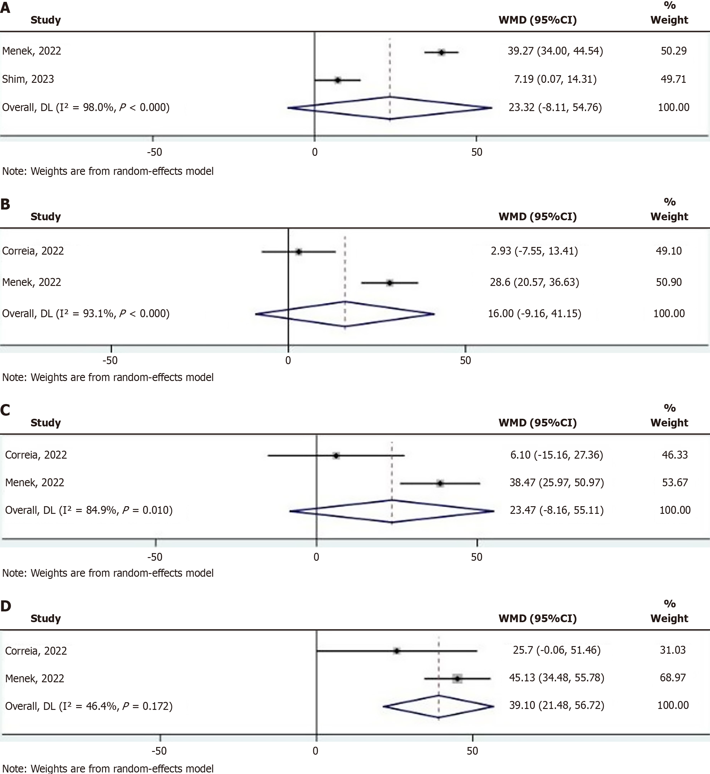 A: Forest plot of studies comparing Disabilities of the Arm, Shoulder and Hand score; B: Forest plot of studies comparing external rotation range of motion (ROM); C: Forest plot of studies comparing flexion ROM; D: Forest plot of studies comparing abduction ROM. WMD: Weighted mean difference.