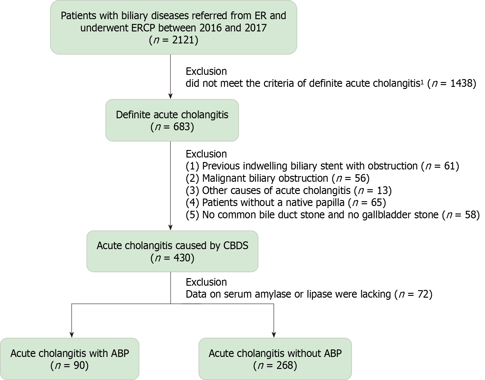 1According to the 2018/2013 Tokyo guidelines. ABP: Acute biliary pancreatitis; CBDS: Common bile duct stones; ER: Emergency room; ERCP: Endoscopic retrograde cholangiopancreatography.
