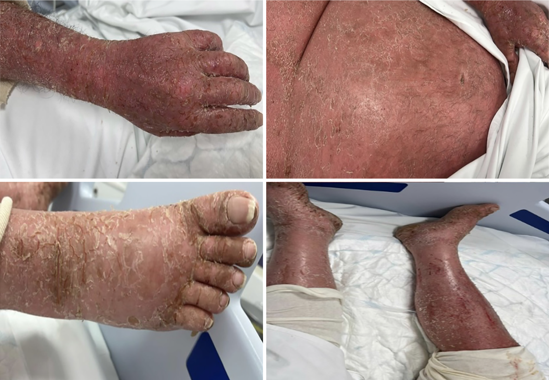 Early erythrodermic psoriasis with approximately 75% body surface area involvement during the first hospitalization, prior to intensive care admission.