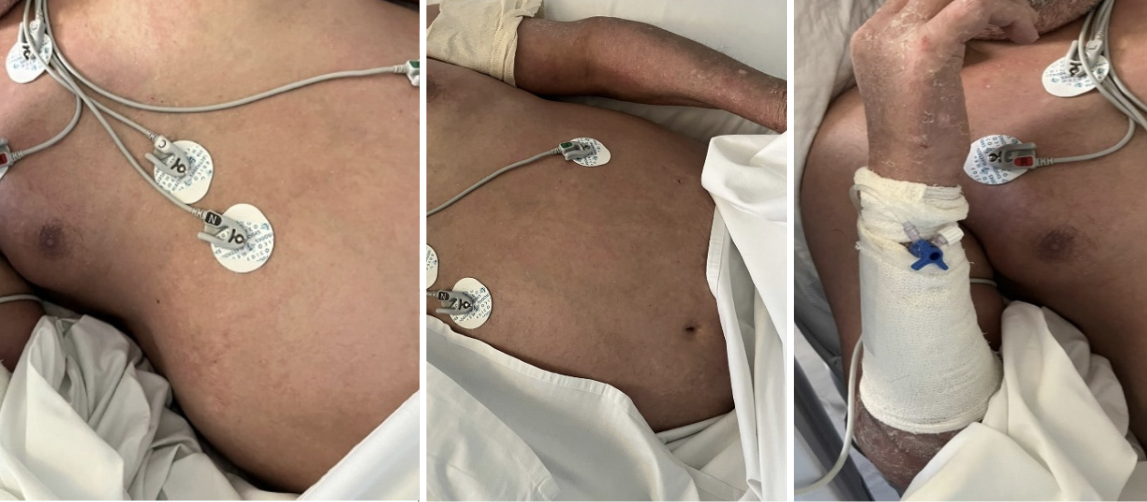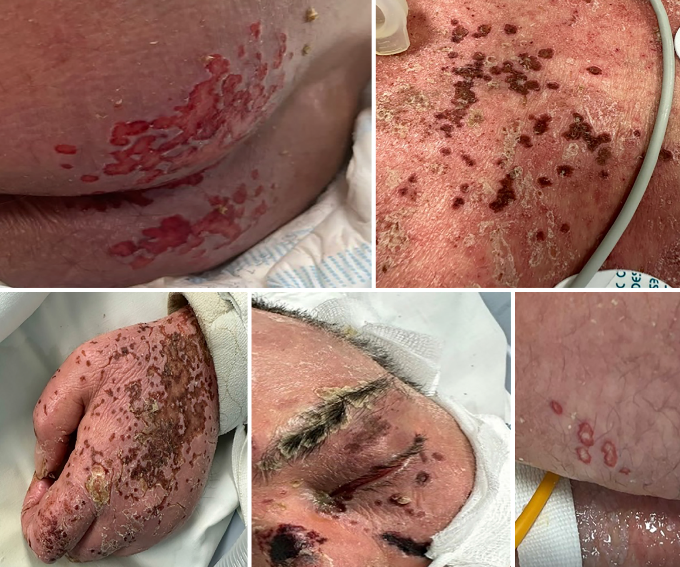 Disseminated cutaneous herpes simplex virus type-1 eruption arising during the second intensive care unit admission, approximately one week after initiation of ixekizumab.