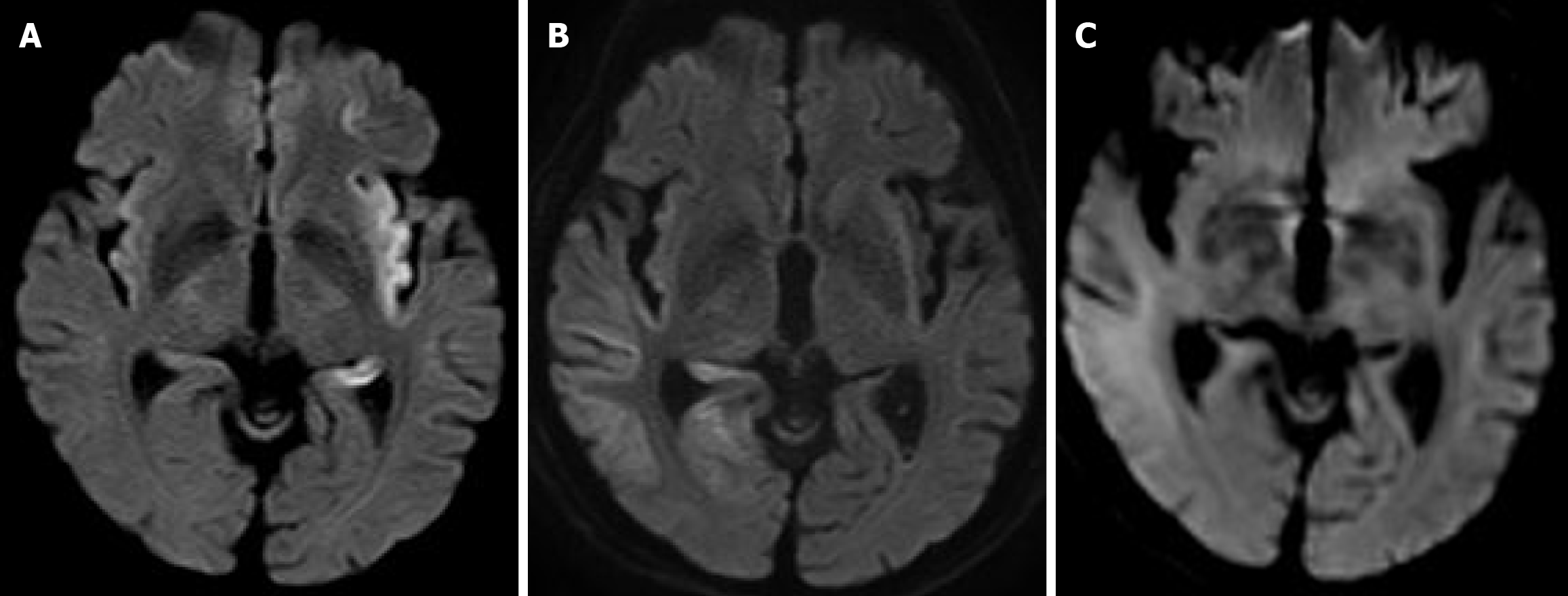 A: On hospital day 3, a high-intensity area between the left temporal lobe and insular cortex was confirmed; B: On hospital day 48, a high-intensity area around the right temporal lobe was newly confirmed; C: On hospital day 117, no new recurrence was confirmed.