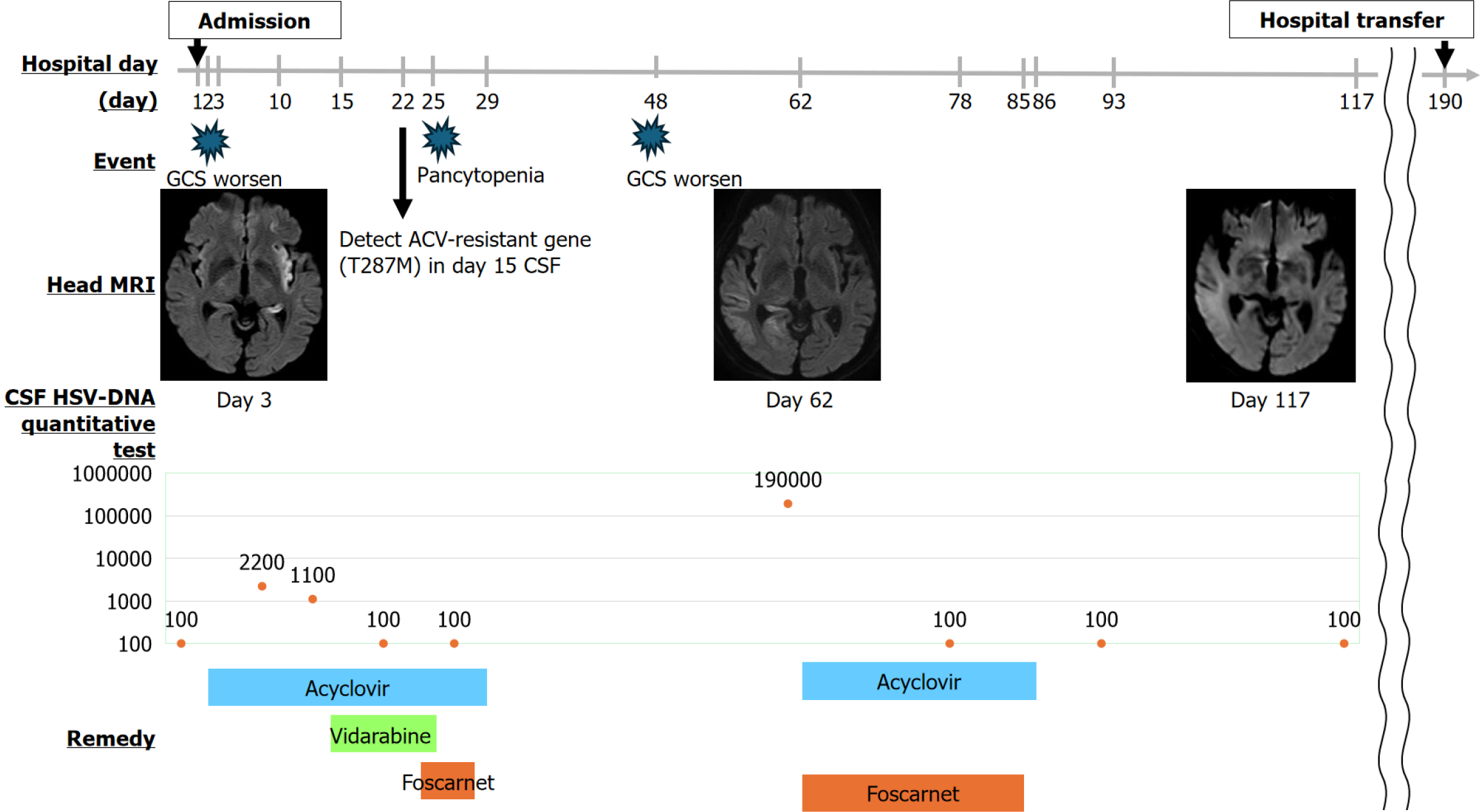 - Citation: Usuda D, Furukawa D, Imaizumi R, Ono R, Kaneoka Y, Nakajima E, Kato M, Sugawara Y, Shimizu R, Inami T, Kawai K, Matsubara S, Tanaka R, Suzuki M, Shimozawa S, Hotchi Y, Osugi I, Katou R, Ito S, Mishima K, Kondo A, Mizuno K, Takami H, Komatsu T, Nomura T, Sugita M. Recurrence of acyclovir-resistant herpes encephalitis in an immunocompromised patient: A case report. World J Clin Cases 2025; 13(34): 111438