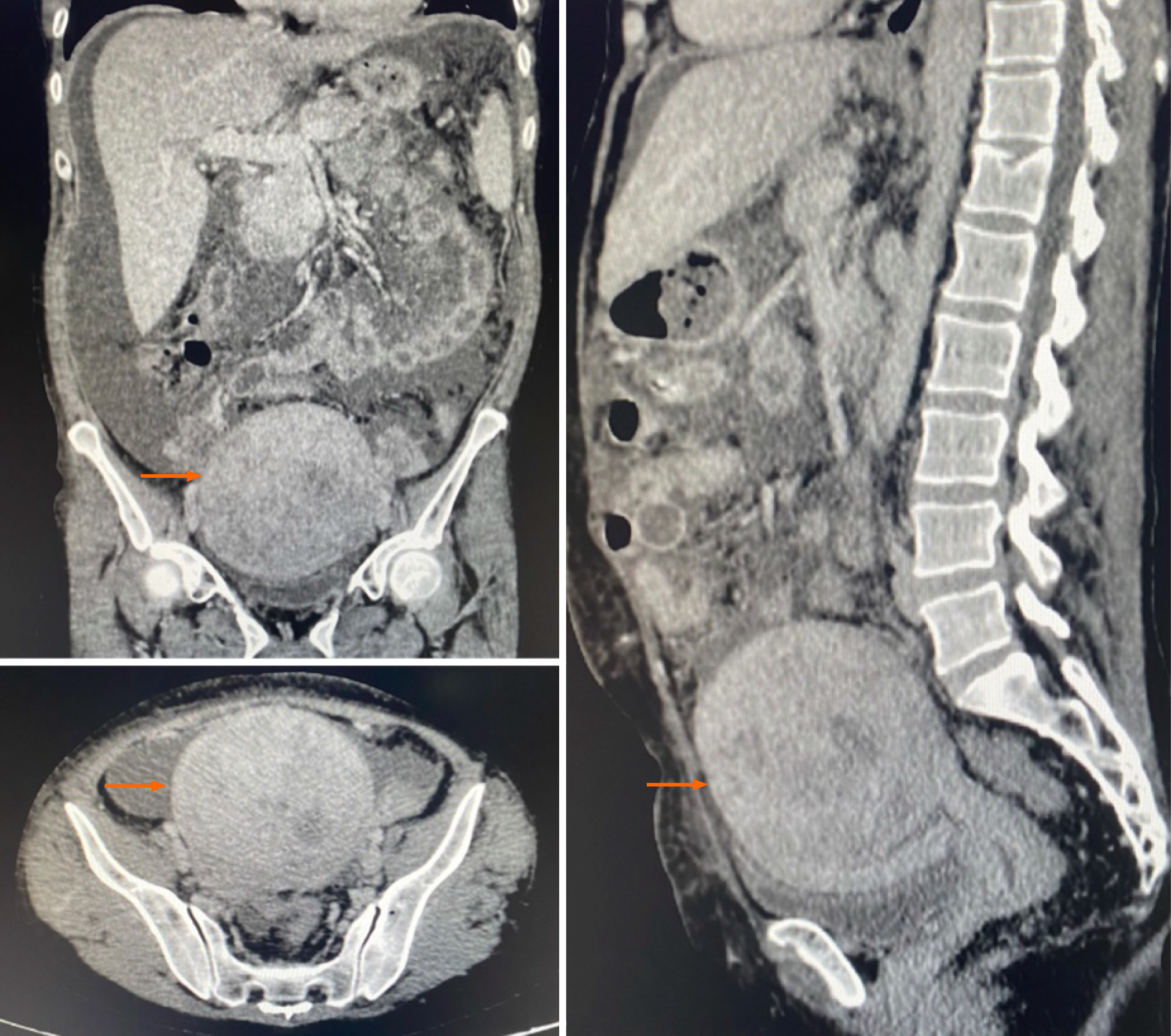 Figure 1 Computed tomography of the abdomen and pelvis showing a well-defined, heterogeneous nodular lesion located in the posterior wall/fundus of the uterus, measuring 10.