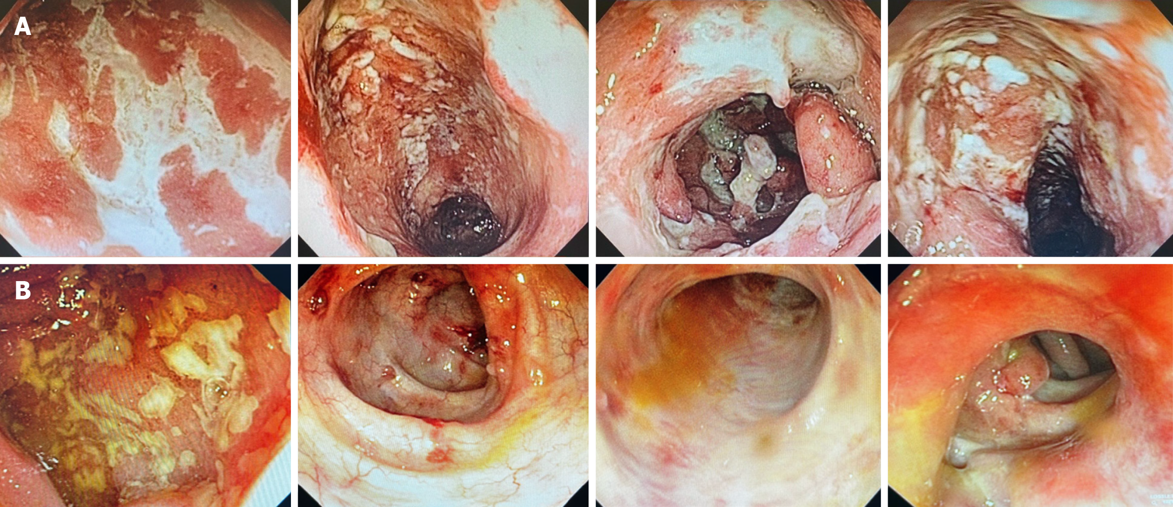 A: Follow-up colonoscopy after vedolizumab therapy, demonstrating severe endoscopic activity of ulcerative colitis in the rectum (Mayo score: 3); B: Most recent colonoscopy showing severe endoscopic activity of ulcerative colitis involving the terminal ileum and other colonic segments (Mayo score: 3).