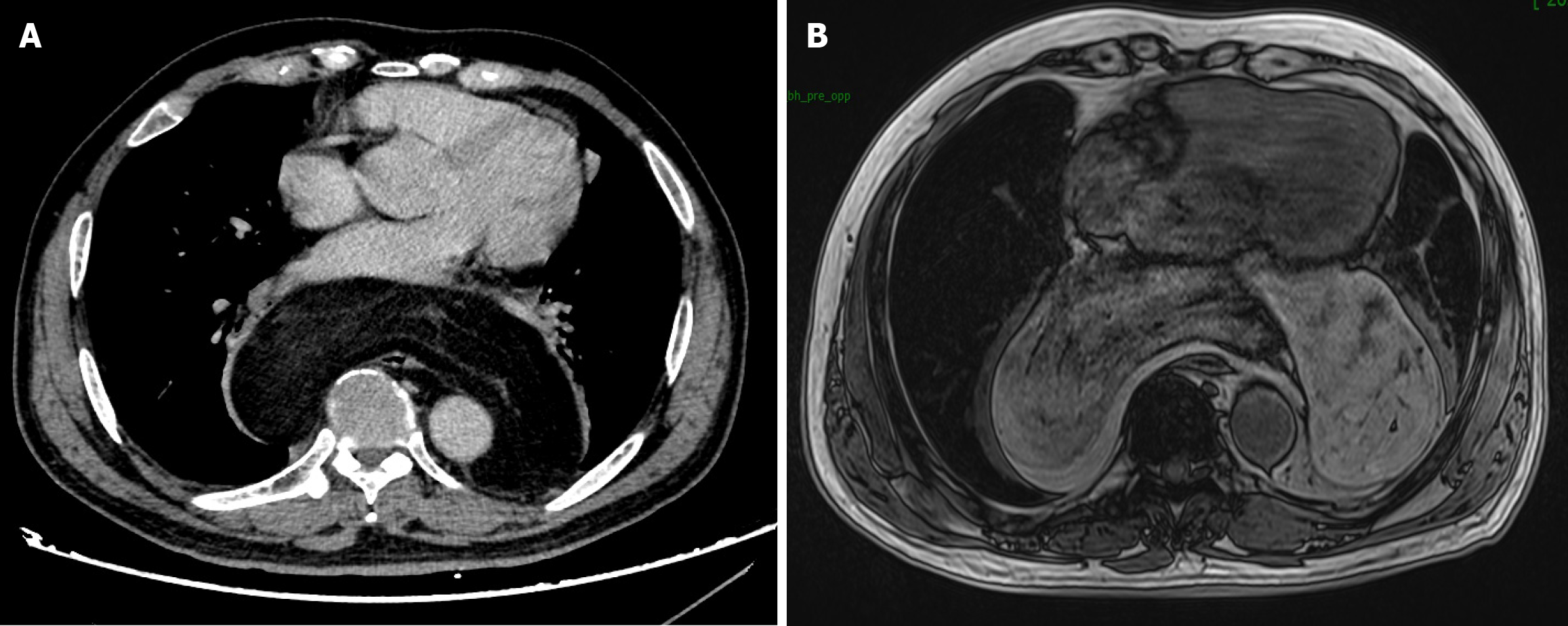 A: Showing a giant posterior mediastinal tumor with a fatty component; B: Showing the tumor extensively involving the esophagus. There was still a small gap between the tumor and the esophagus.