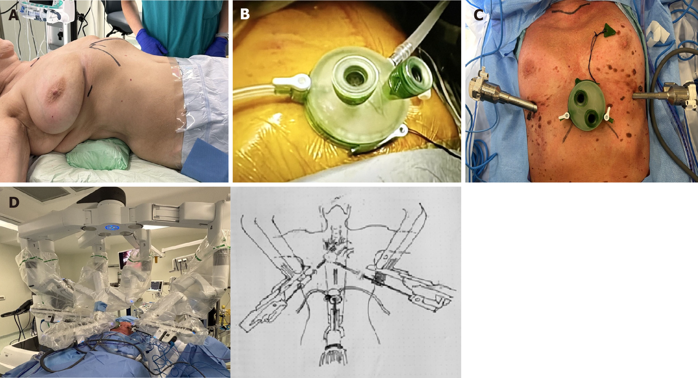 A: Patient position for the subxiphoid robotic-assisted thoracic surgery (RATS) approach; B: The gel port is positioned through the subxiphoid incision, with the carbon dioxide tubing connected to maintain insufflation during the robotic-assisted procedure; C: Port configuration for the subxiphoid RATS approach. The gel port is positioned through the subxiphoid incision and connected to the carbon dioxide insufflation line to maintain the operative field. Two additional trocars are placed - one on the right and one on the left side - to allow optimal access for the robotic instruments; D: The robotic system operating during the subxiphoid RATS.