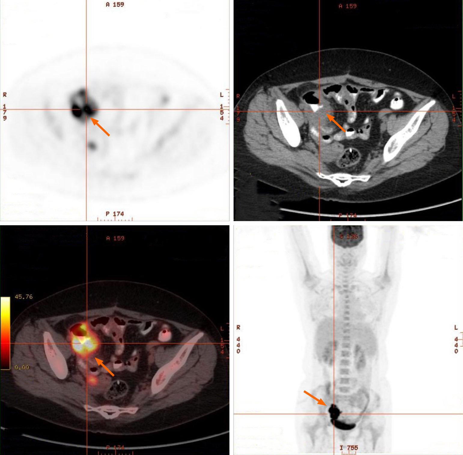 Positron emission tomography/computed tomography revealed localized thickening of the small intestinal wall in the right pelvic region with increased metabolic activity, suggestive of implantation metastasis. The arrows point to the focal area of intestinal wall thickening with high metabolic activity.