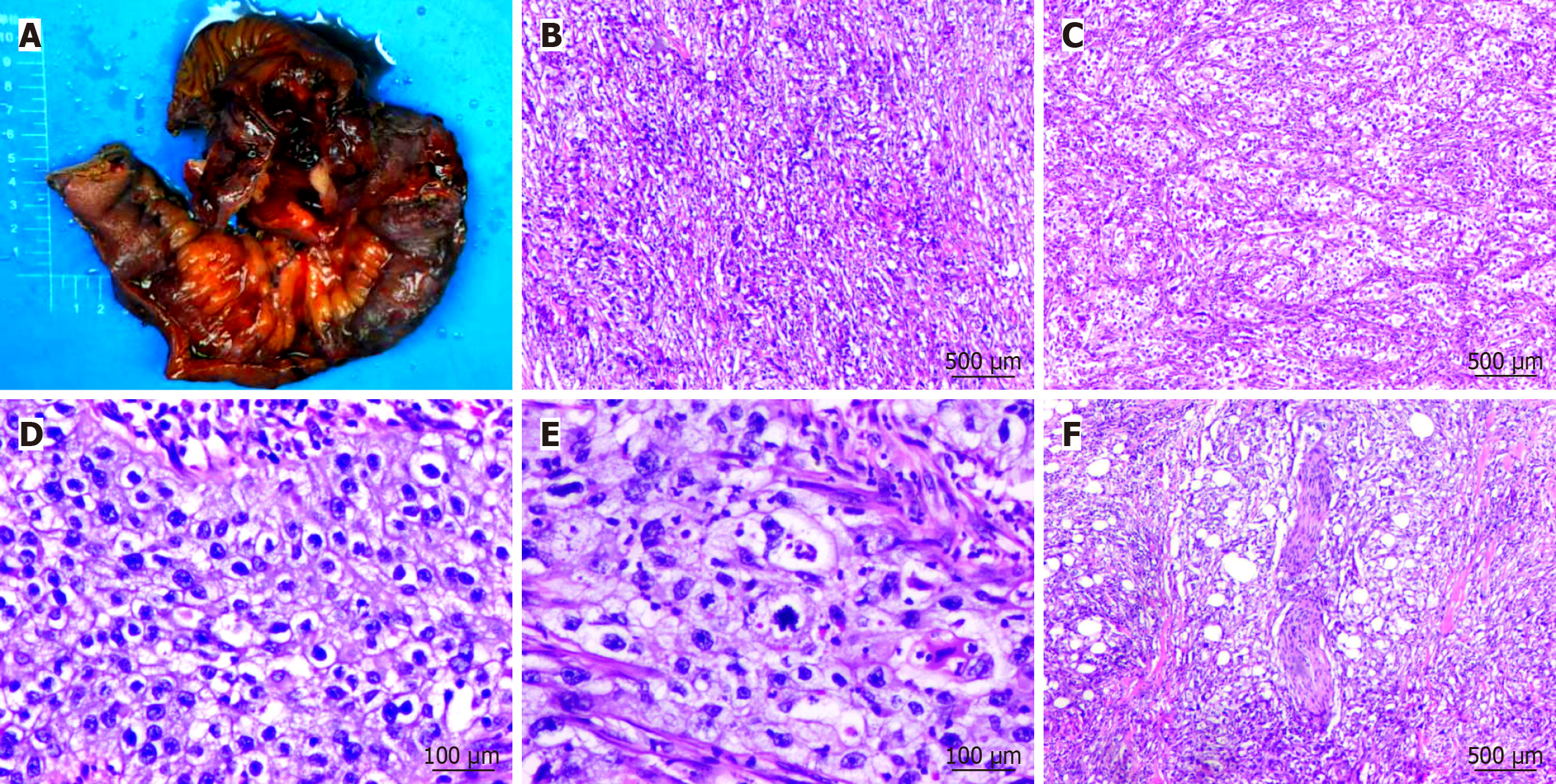 A: Gross specimen of primary ileal squamous cell carcinoma; B: Tumor cells arranged in solid sheet-like patterns (40 ×); C: Tumor cells forming nested clusters (40 ×); D: Tumor cells with abundant clear cytoplasm (200 ×); E: Pathological mitotic figures identified (200 ×); F: Evidence of perineural invasion by tumor cells (40 ×). The primary tumor mass observed in the resected intestinal specimen.
