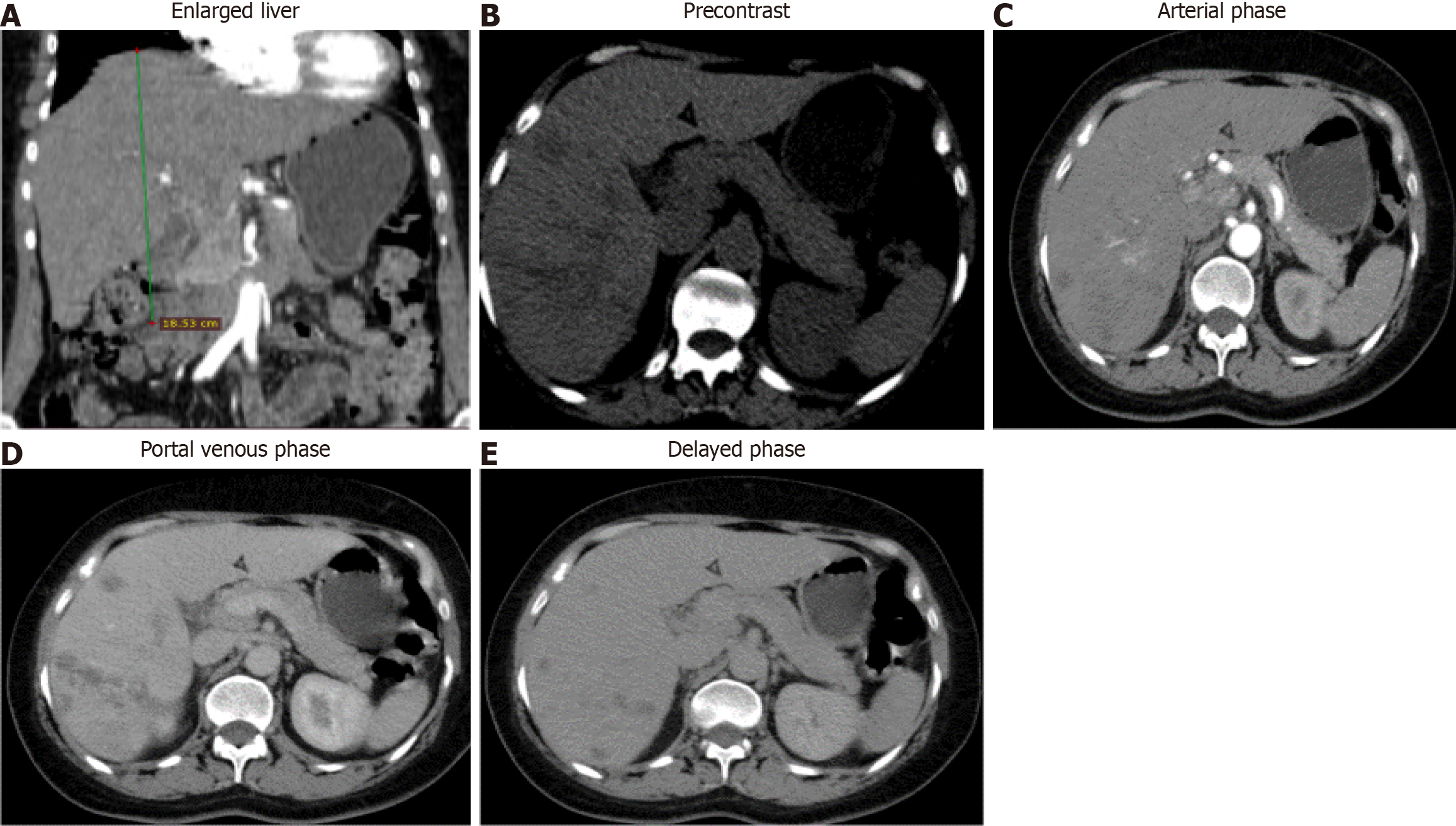A: Abdominal computed tomography scan showed an enlarged liver; B: Shows multiple ill-defined hypodense lesions in the right lobe; C: Shows the largest lesion, a 5.3 cm × 3.3 cm measuring hypodense lesion having minimal arterial enhancement; D: Shows the delayed portal venous phase; E: Shows a slight filling in the delayed phase with the underlying hepatic parenchyma having internal attenuation more around the periportal area, which was consistent with fascioliasis.