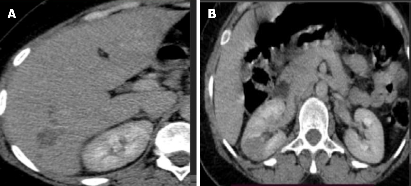 A and B: The above computed tomography image showed hepatic segment 6 small subcapsular hypodense lesion with peripheral enhancement likely Fasciola hepatica (the hepatic lesions on segment 6 were clusters of oval hypodense nodules with peripheral enhancement where there is also mild biliary tree dilatation) (A). Multiple hyperdense lesions were also seen on both kidney’s (B).