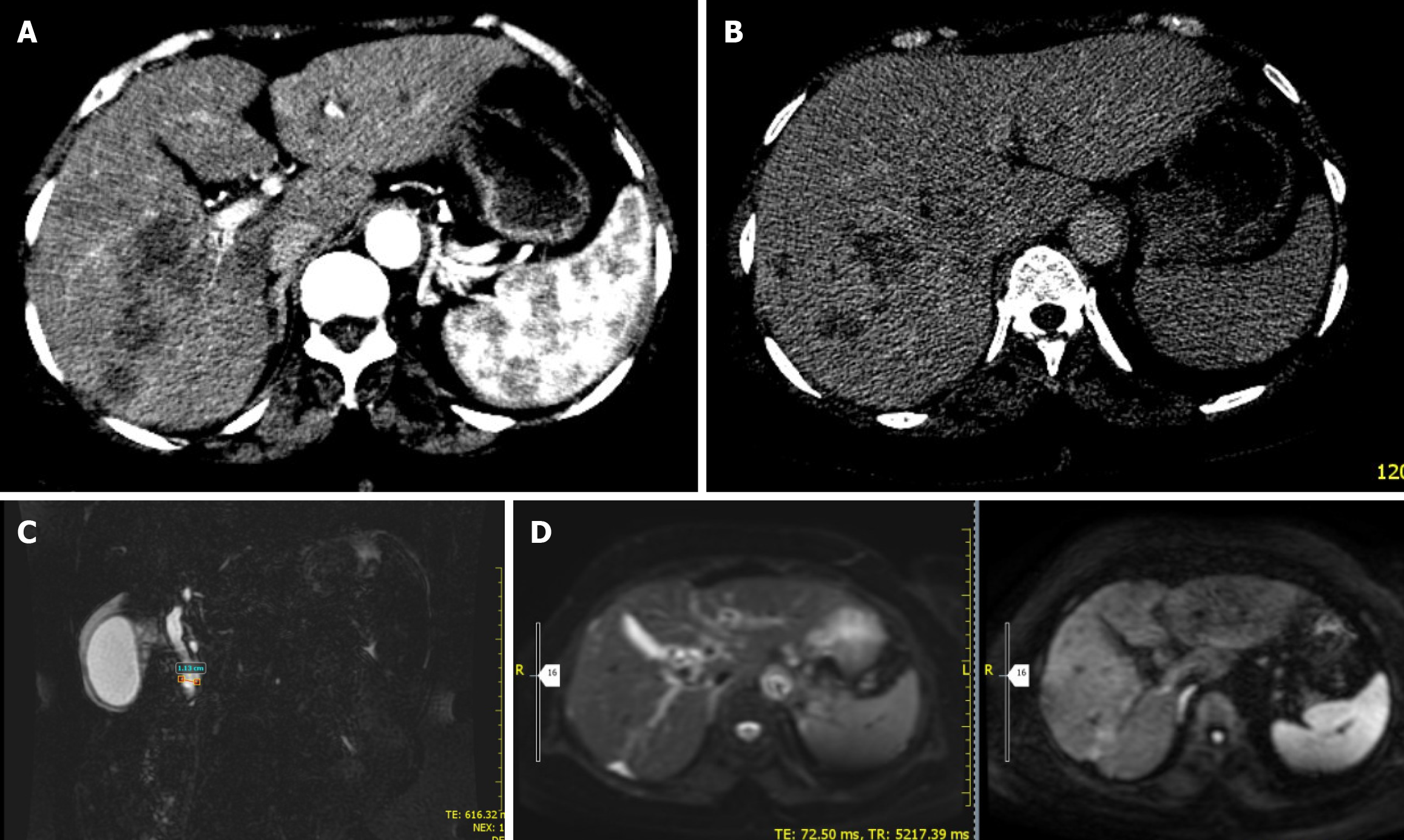 A-C: Showed normal sized liver with segment VI 6 cm × 5.4 cm hypodense, poorly defined lesion with heterogeneous enhancement. Segment VII multiple smaller (1-1.5 cm) satellite nodules with similar characteristics. There was also a central intrahepatic duct dilatation with normal common hepatic duct size.