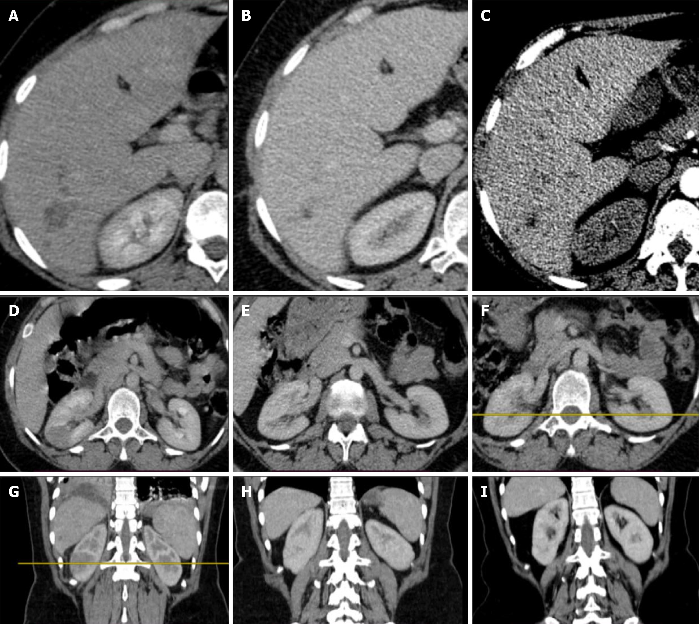 A-C: Abdominal computed tomography (CT) images of the liver showing changes with treatment; D-F: Abdominal CT images of the kidneys showing improvement with treatment; G-I: Abdominal CT scans demonstrating the progression of hepatic and renal lesions throughout the clinical course, from initial presentation to post-treatment follow-up.