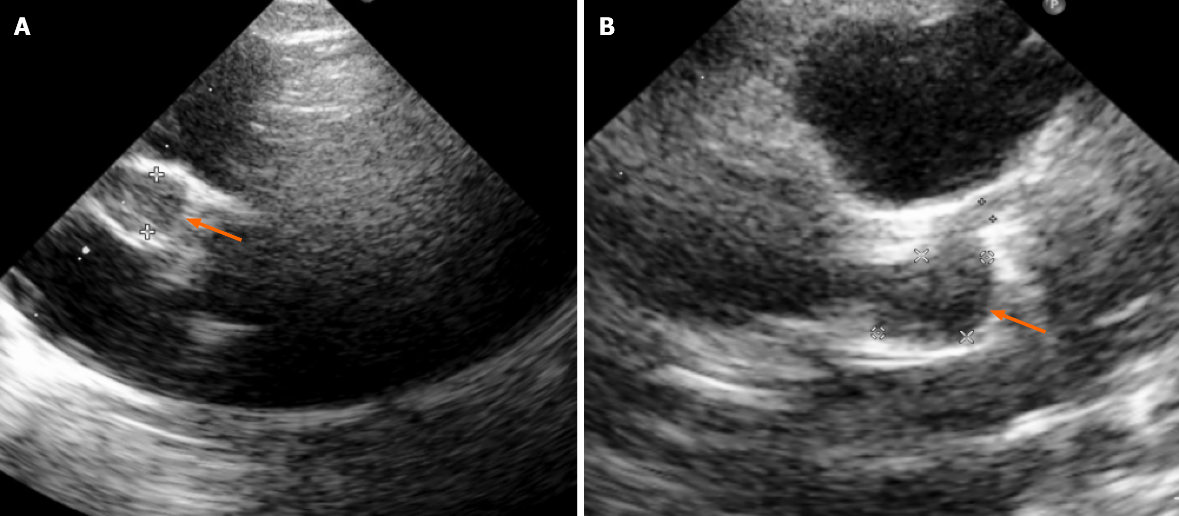 Figure 1 Bedside echocardiography demonstrating giant bilateral coronary artery aneurysms (indicated by orange arrows).