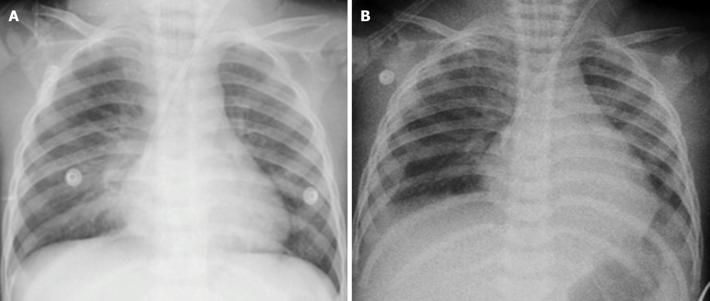 A: Acute pulmonary edema at admission; B: Significant improvement after 5 days of mechanical ventilation, combined continuous renal replacement therapy and plasma exchange.