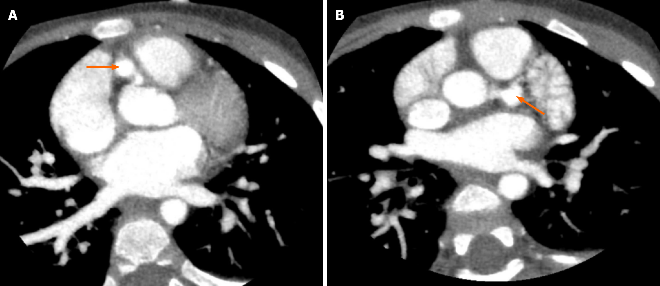 Figure 4 Contrast-enhanced computed tomography scans of the coronary arteries, with orange arrows indicating the dilated coronary artery.
