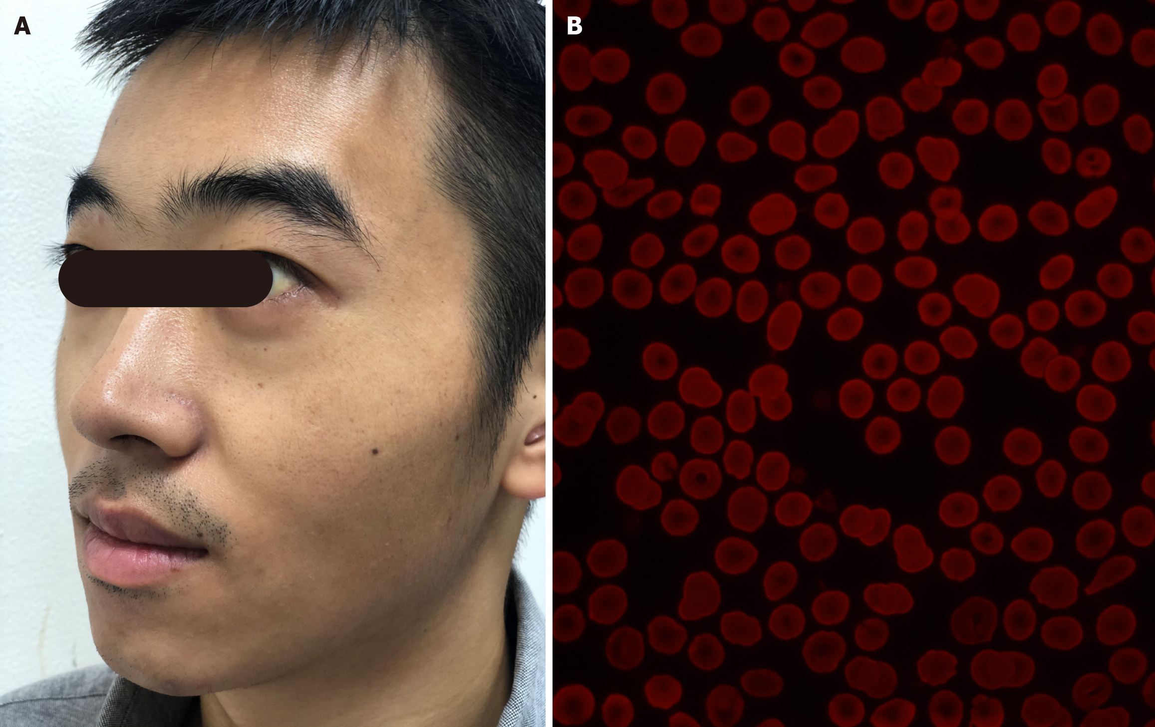 A: Mild icterus of the sclera without facial injuring scar; B: A large number of fluorocytes in the peripheral blood.