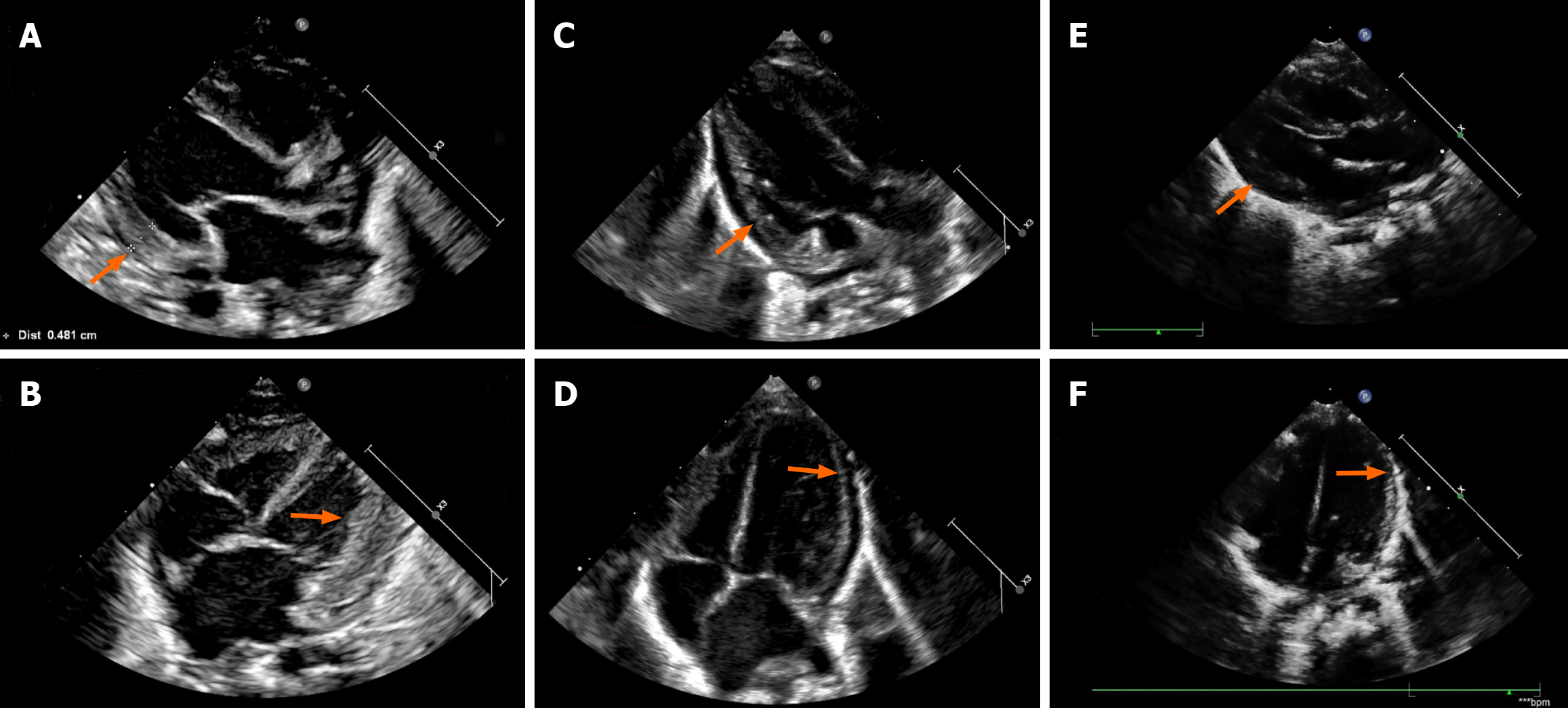 A and B: Cardiac ultrasound (pre-levothyroxine and 2 days post-levothyroxine) revealed left ventricular hypertrophy and left heart enlargement (orange arrows); C and D: Ultrasound (29 days post-levothyroxine) showed improvement in left heart size and left ventricular hypertrophy (orange arrows); E and F: Ultrasound (92 days post-levothyroxine) showed normalized cardiac structure (orange arrows).
