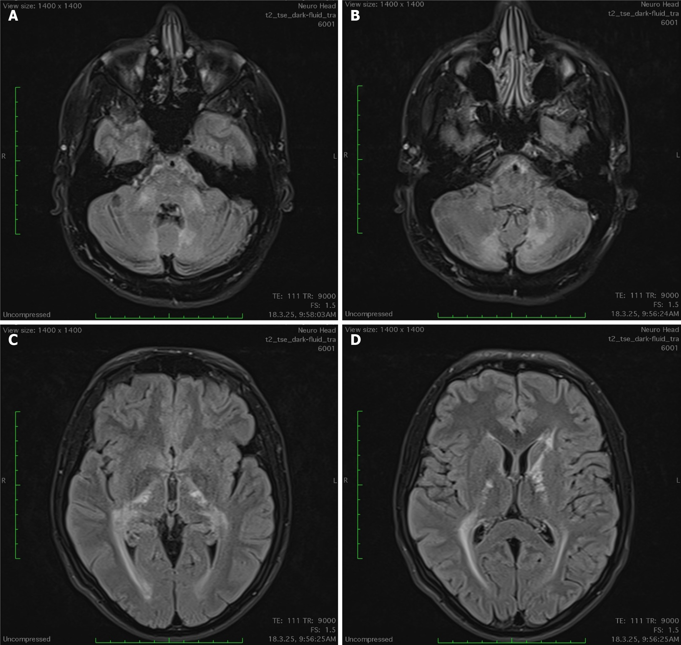 Figure 1 Brain magnetic resonance imaging showing bilateral nearly symmetrical white matter hyperintensities on T2-weighted, fluid-attenuated inversion recovery sequences.