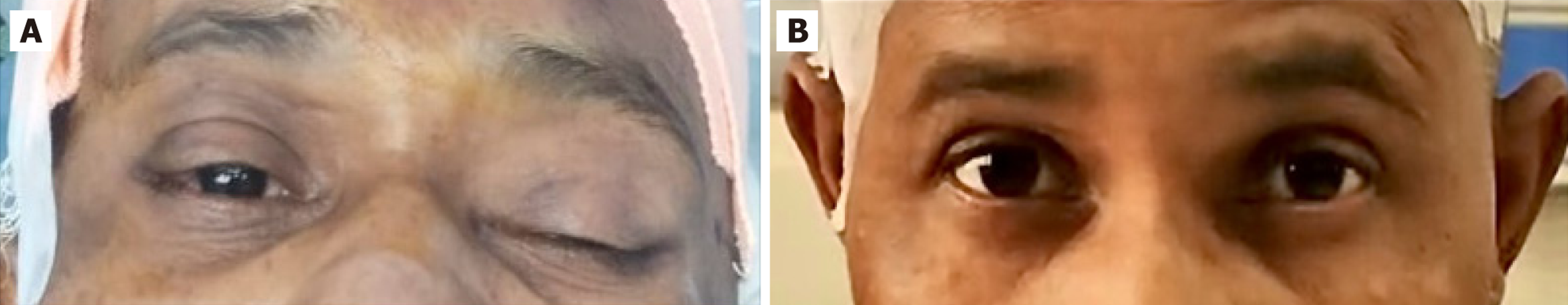 A: Left eye ptosis after surgery; B: Complete resolution of ptosis 12 hours after surgery.