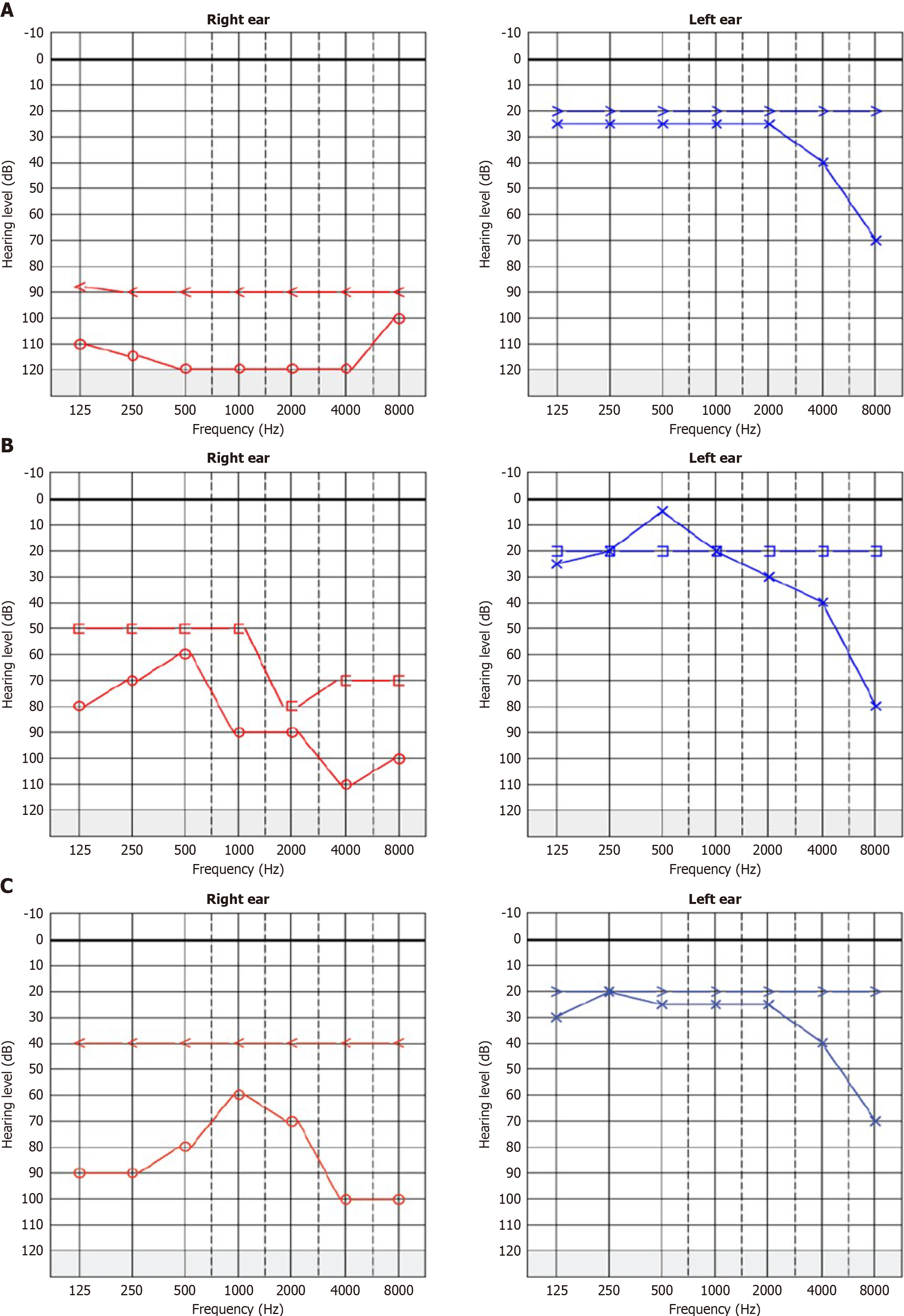 A: Performed in 2013; B: Performed in 2019; C: Performed in 2024, showing severe sensorineural hearing loss in the right ear. The left ear depicts normal hearing with high-frequency loss at 4 kHz and 8 kHz.
