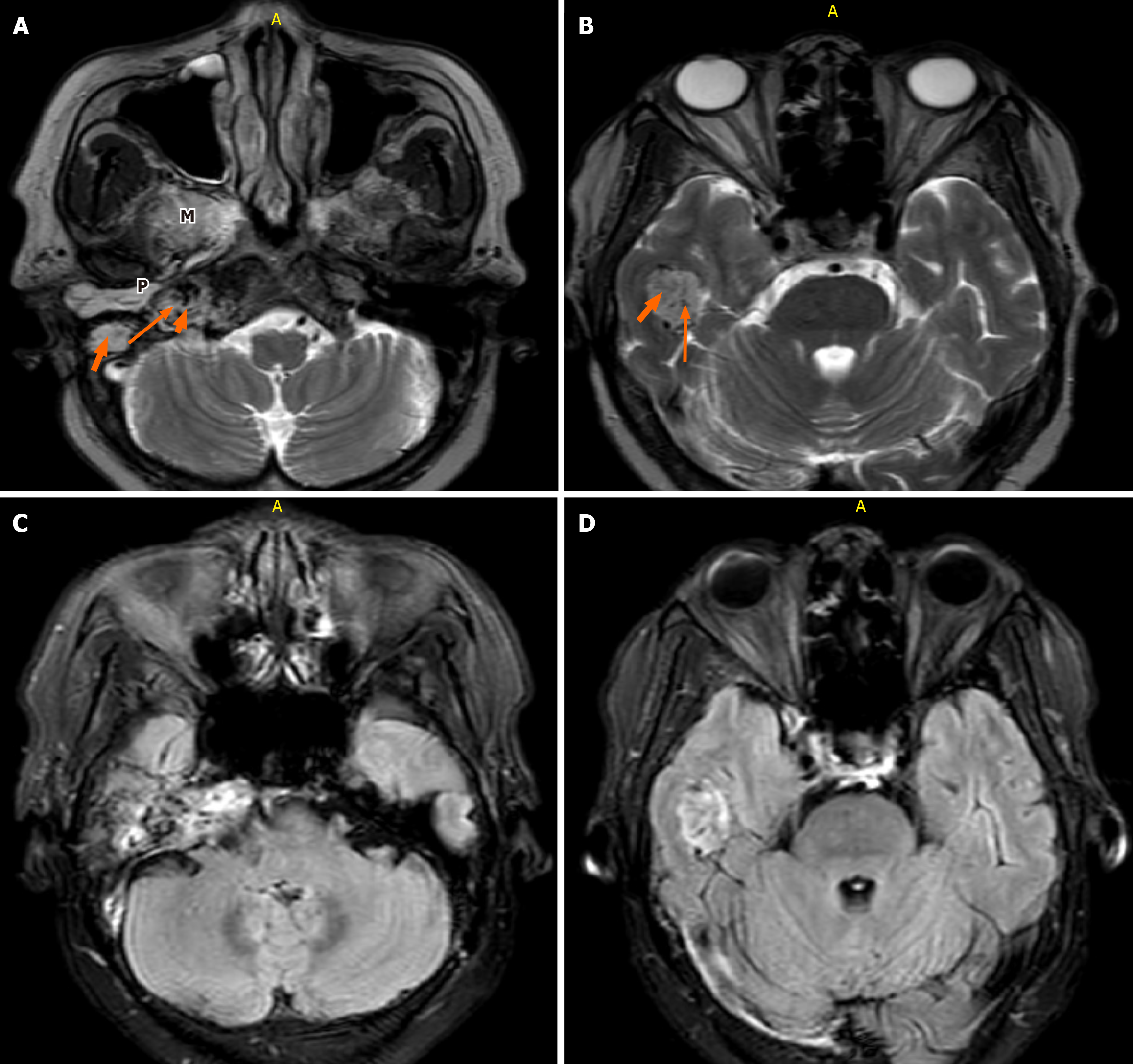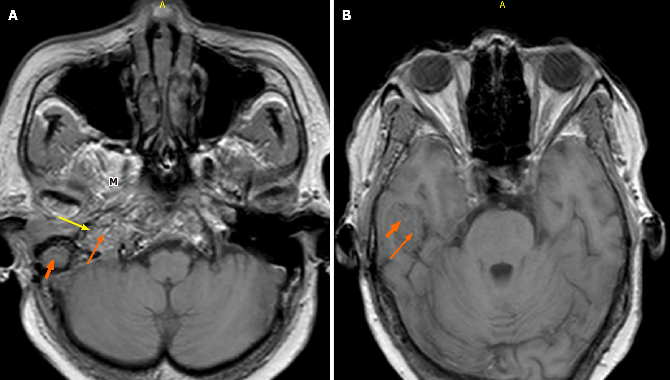 A and B: Of the brain demonstrates a poorly defined heterogeneous mass of slight hyperintensity and hypointensity centered at the right jugular fossa. A: Characteristic “salt” and “pepper” appearance is observed with punctate regions of hyperintensity representing the “salt” and small flow voids representing the “pepper” (long orange arrow and yellow arrow, respectively). Middle ear extension (thick short arrow) and masticator space (M) are seen; B: The right temporal lobe extension is demonstrated.