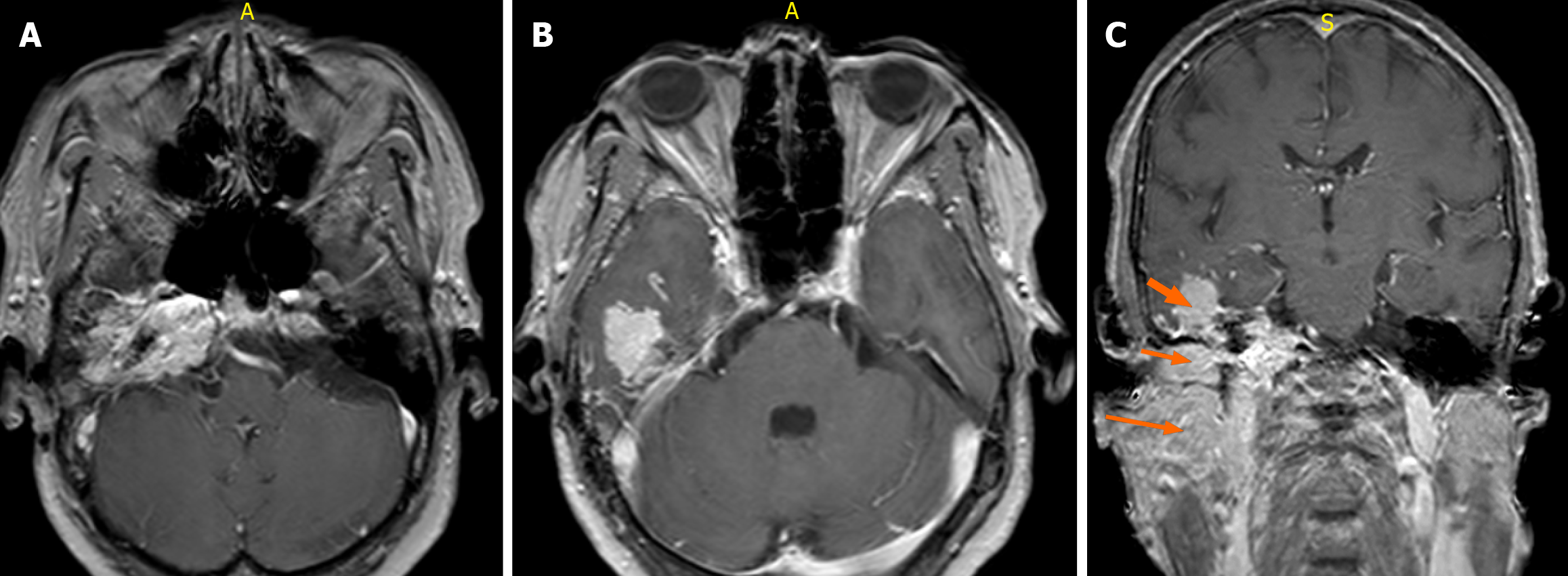 A and B: Axial gadolinium-enhanced T1-weighted fast field echo (FFE) magnetic resonance imaging (repetition time 500-700 milliseconds, echo time 10-20 milliseconds, flip angle 20°-30°, slice thickness 3 mm) following intravenous administration of gadolinium-based contrast (0.1 mmol/kg) demonstrates avid enhancement of the lesion involving the right jugular foramen, middle ear cavity, and ipsilateral temporal lobe; C: Coronal T1-weighted FFE post-contrast image shows an intensely enhancing mass in the right jugular fossa with superolateral extension into the ipsilateral inferior temporal lobe (short thick arrow), inferior extension into the ipsilateral middle ear cavity (short thin arrow), and further spread into the masticator space (long arrow).