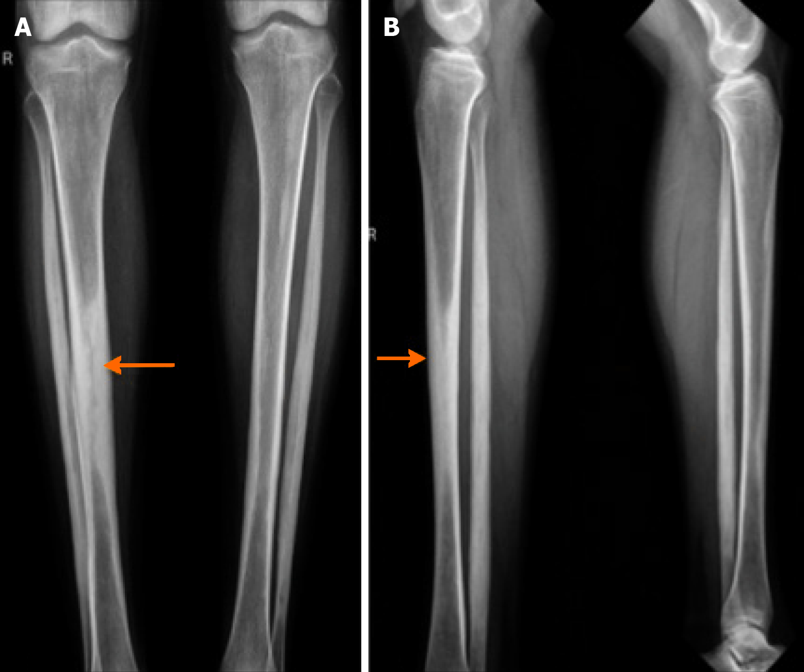 A and B: Anterior and lateral view showing bilateral, symmetric, osteosclerosis of the metaphyseal-diaphyseal regions (“candle wax” appearance) (arrows).