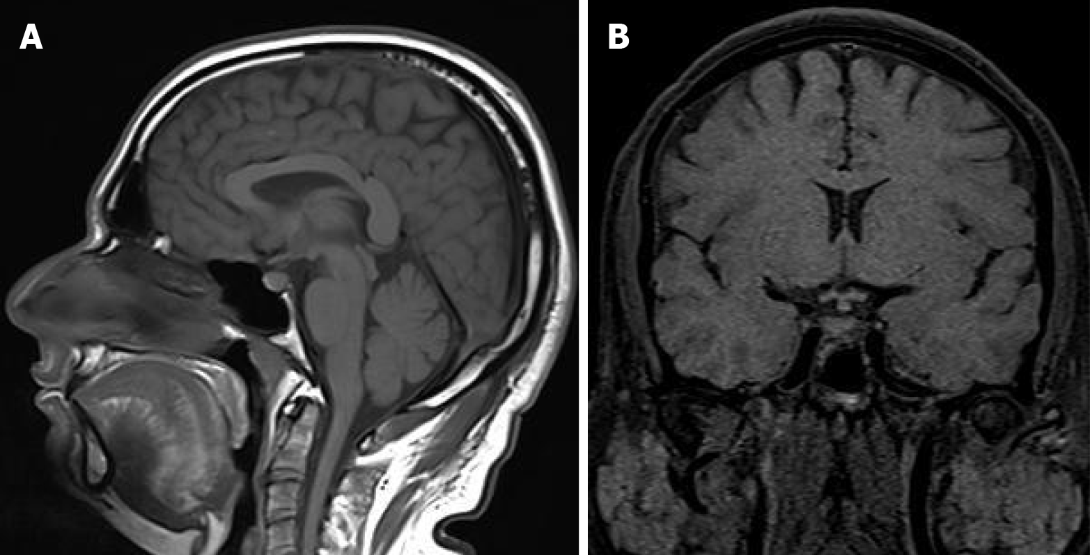 A: Sagittal view of magnetic resonance imaging (MRI) brain showing absent pituitary shadow and thickened stalk; B: Coronal view of MRI brain showing absent pituitary shadow and thickened stalk.