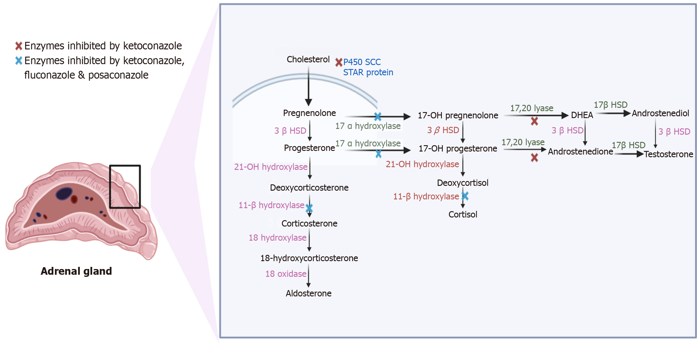 Figure 1 Adrenal steroidogenesis and enzymes blocked by azoles.