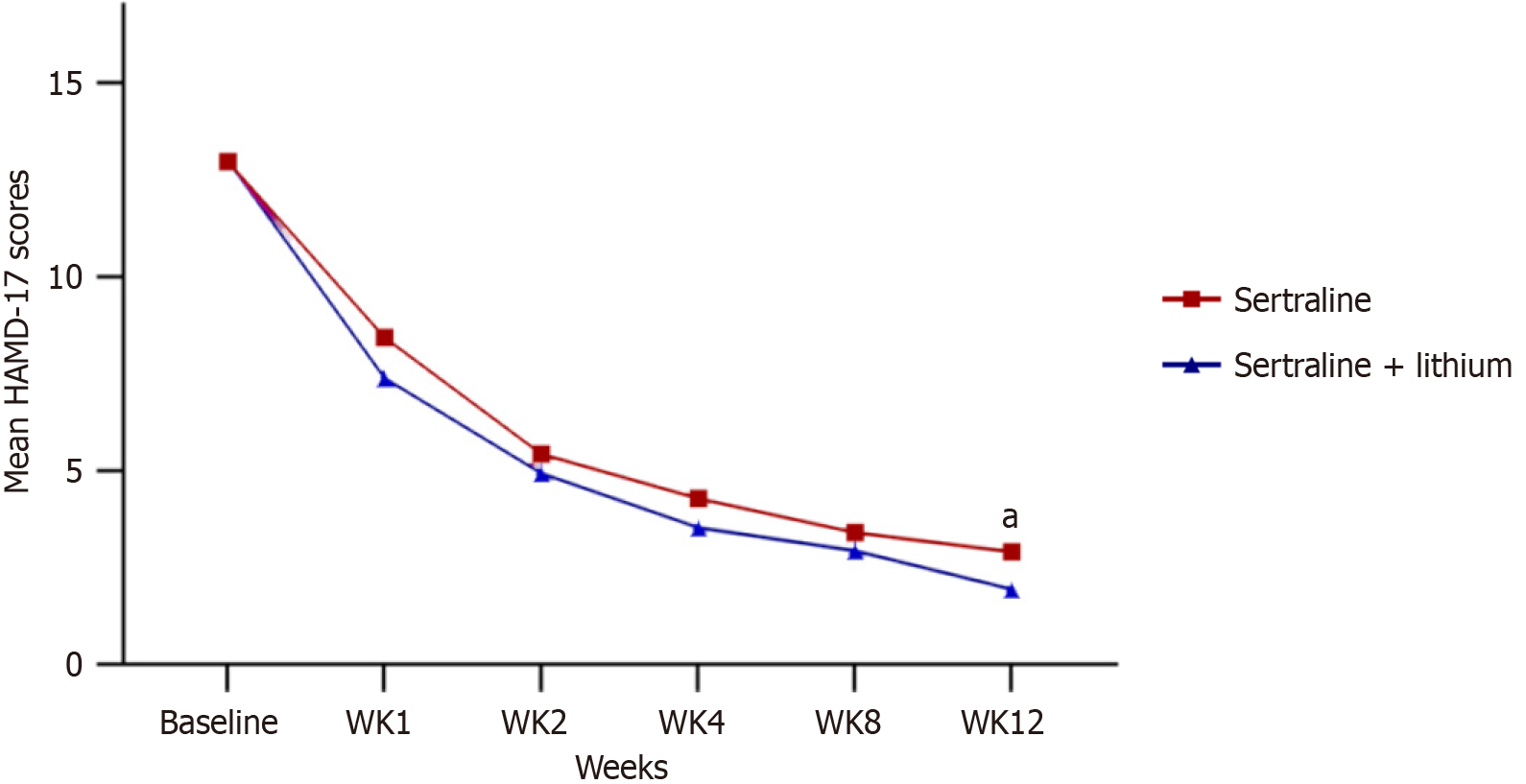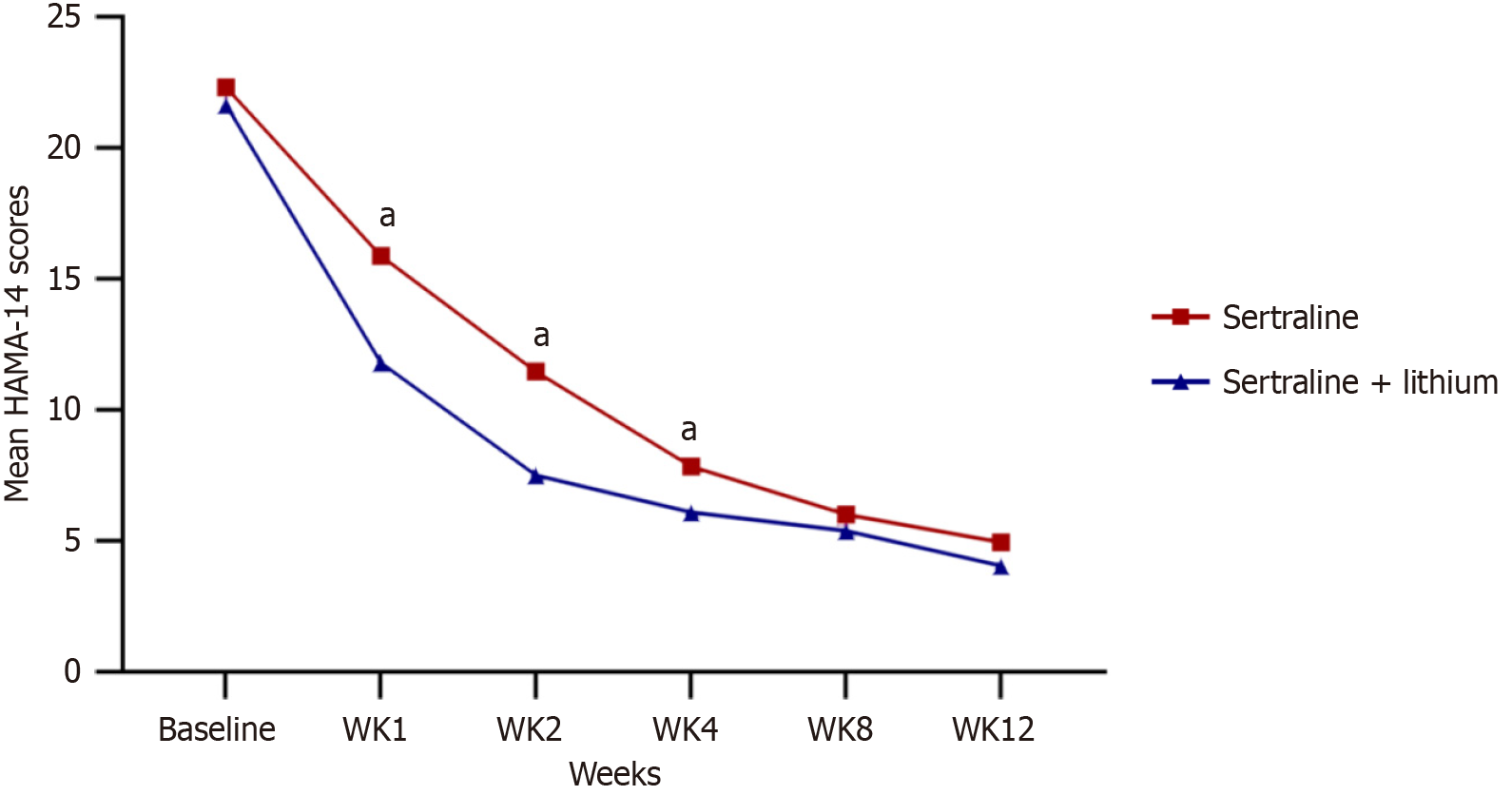 Data points represent the estimated mean change from baseline in Hamilton Anxiety Rating Scale 14 scores for the sertraline + lithium combination group (group B) and the sertraline monotherapy group (group A), based on the intention-to-treat population. Error bars represent 95% confidence intervals. aP < 0.05. HAMA: Hamilton Anxiety Rating Scale.