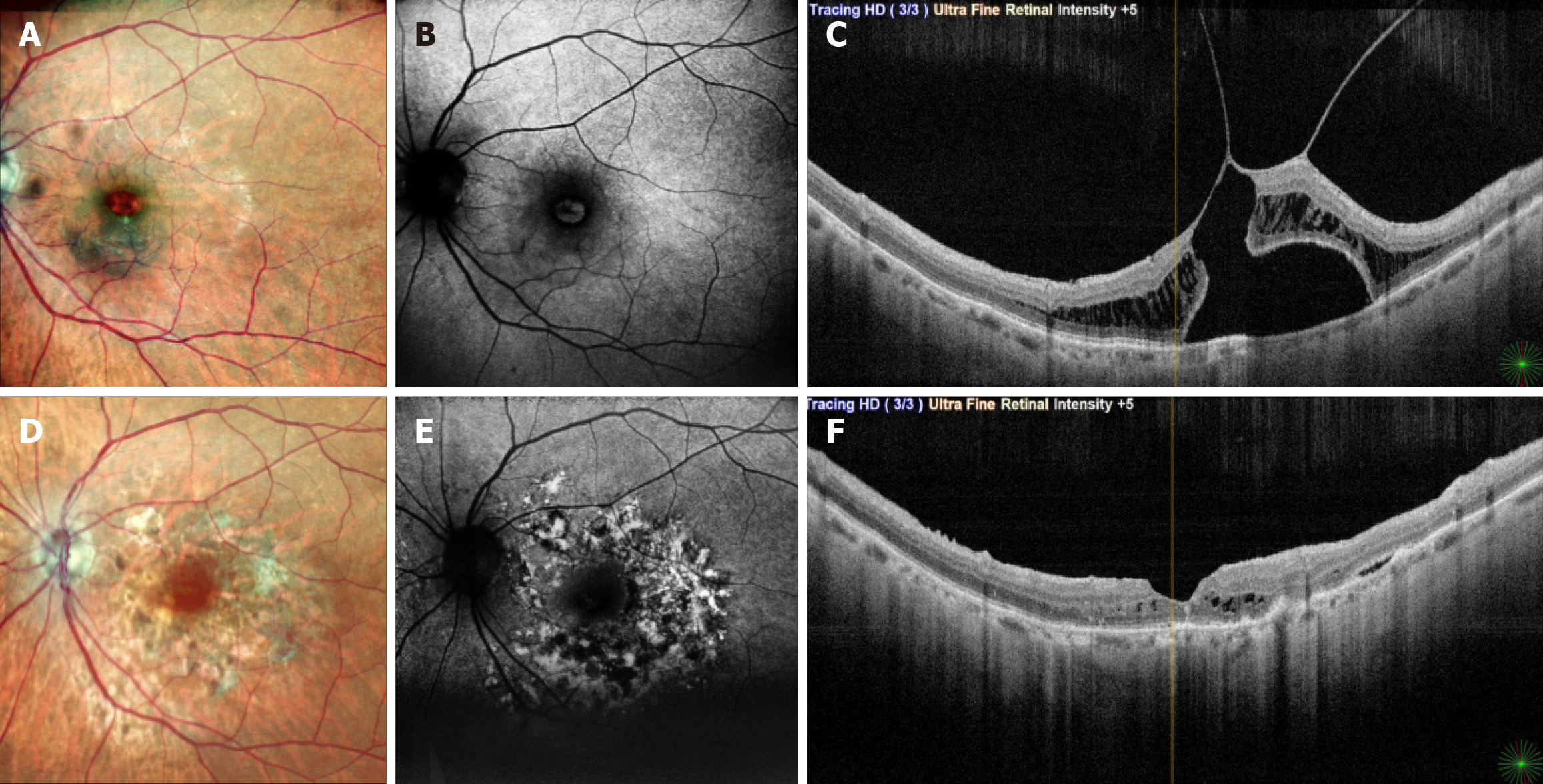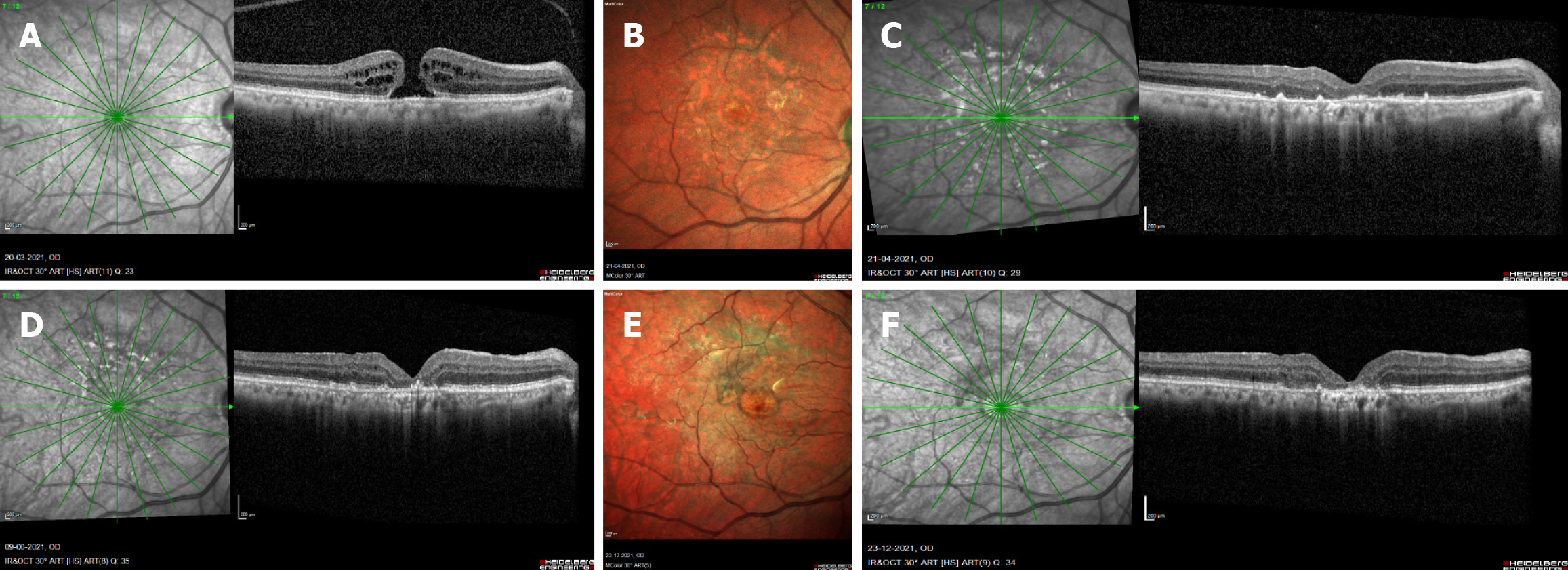 This figure corresponds to patient 2, who underwent surgery for an idiopathic macular hole (MH) in the right eye with an initial visual acuity of 6/24. A: Preoperative optical coherence tomography (OCT) revealed a fully detached posterior vitreous cortex, intraretinal cystic spaces, and intact retinal pigment epithelium (RPE) at the fovea. Internal limiting membrane (ILM) staining was performed under air for 2 minutes. The total surgical time was 95 minutes; B and C: One month postoperatively, OCT showed a closed MH with photoreceptor and RPE damage in the foveal and parafoveal regions, corresponding to the ILM peel area, with visual acuity of 6/36; D-F: At 3- and 9-months post-surgery, the hole remained closed, but progressive outer retinal and RPE thinning with increased choroidal hyperreflectivity was observed. Visual acuity at the final visit remained 6/36.