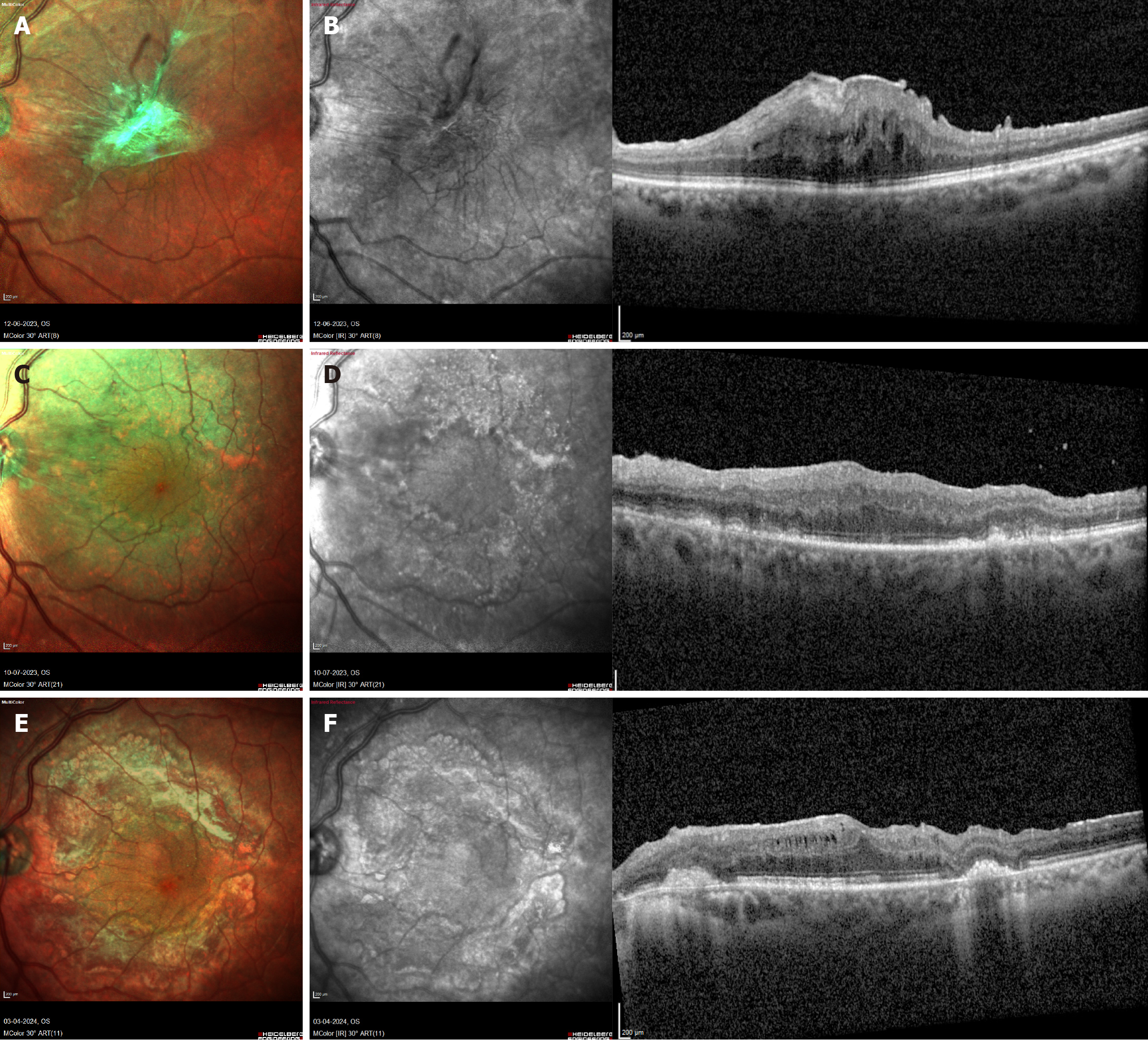 A and B: Correspond to patient 8, who underwent surgery for an epiretinal membrane in the left eye, presenting with retinal traction and increased retinal thickness (590 µm). The initial visual acuity was 6/30. Preoperative optical coherence tomography (OCT) showed significant retinal traction caused by the thick epiretinal membrane, with intact outer retinal layers and retinal pigment epithelium (RPE) at the fovea. ILM staining was performed twice under air for a total of 3.5 minutes, with a surgical time of 110 minutes; C and D: Ten days postoperatively, OCT revealed outer retinal layer damage and RPE mottling, sparing the fovea. The parafoveal damage corresponded to the ILM peel area, with visual acuity improving to 6/24; E and F: At 10 months post-surgery, further reduction in foveal thickness was observed, with visual acuity improving to 6/8 and the brilliant blue G related retinal toxicity sparing the fovea.