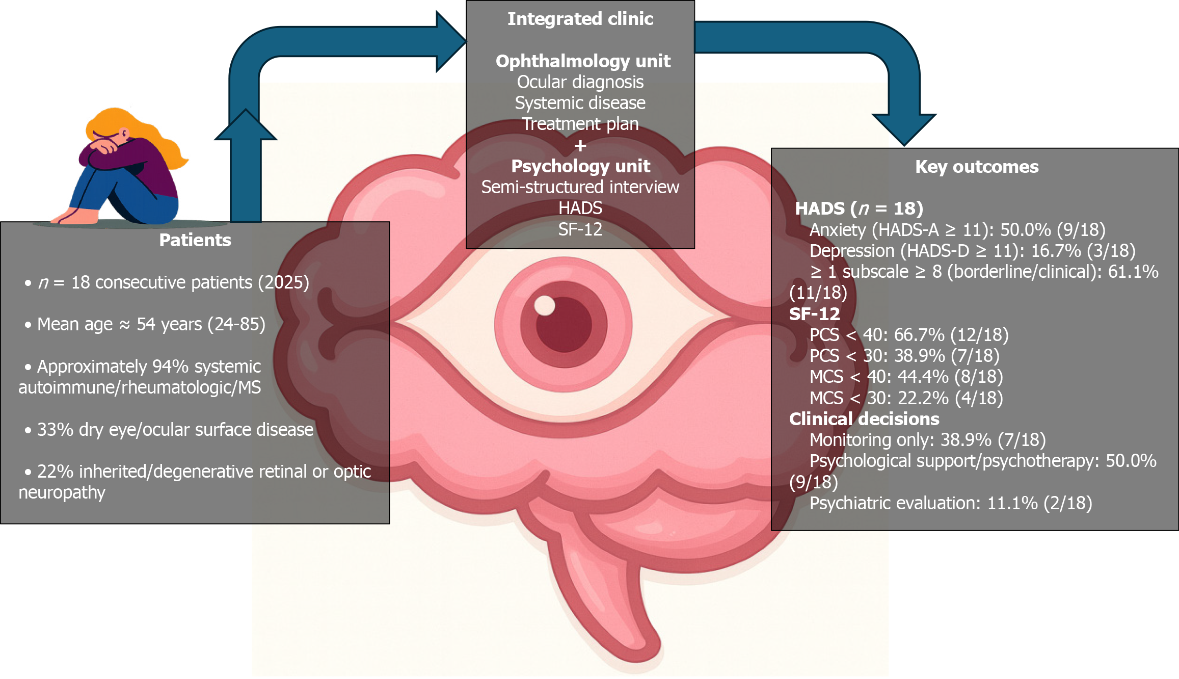 Eighteen consecutive adults with autoimmune, inflammatory, or rare ophthalmic conditions evaluated during routine clinical activity in 2025 underwent a comprehensive visit that included an ophthalmologic assessment, a semi-structured psychological interview, and brief standardized screenings using the Hospital Anxiety and Depression Scale (HADS) and the 12-item Short Form Health Survey (SF-12). Descriptive data revealed clinically significant anxiety symptoms (HADS-anxiety > 11) in 9 out of 18 patients (50.0%) and depressive symptoms (HADS-depression ≥ 11) in 3 out of 18 (16.7%). Reduced physical quality of life (SF-12 physical component summary < 40) was noted in 12 of 18 patients (66.7%), whereas diminished mental quality of life (SF-12 mental component summary < 40) was reported in 8 of 18 patients (44.4%). The integrated assessment findings guided future clinical management, including monitoring, referral for psychological support or psychotherapy, or referral for an additional psychiatric examination. HADS: Hospital Anxiety and Depression Scale; SF-12: 12-item Short Form Health Survey; PCS: Physical component summary; MCS: Mental component summary; HADS-A: Hospital Anxiety and Depression Scale anxiety; HADS-D: Hospital Anxiety and Depression Scale depression.